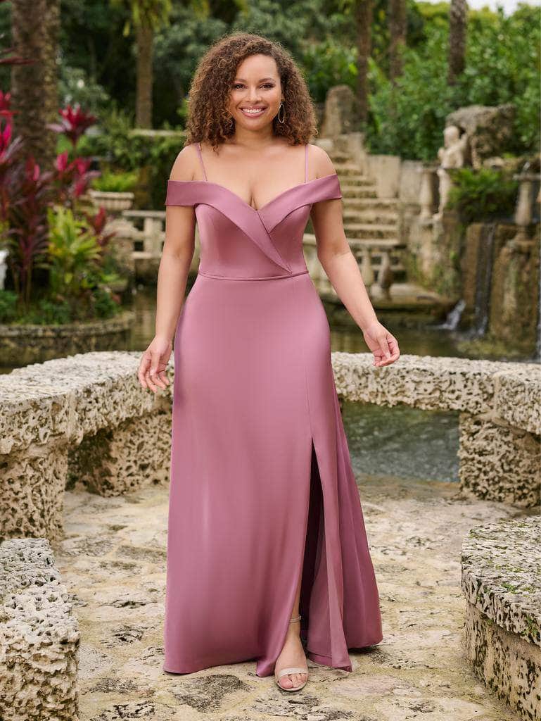 Make a splash at any event with this striking design by Christina Wu Celebration 22223. Eye-catching in cold shoulder bodice, this charmeuse gown exudes a sense of charm and luxury. The fold-over detailing on the off-shoulder sweetheart neckline and cap sleeves are standout features, while the spaghetti straps provide comfortable support. With a daring high slit for ease of movement, the skirt molds an A-line silhouette that streams to the full-length hem. A seamless fit is provided by the concealed zipper on the midrise V-back. Enjoy the astounding beauty of this Christina Wu Celebration 22223 masterpiece. Models are wearing Black, Romance, Romance, Chambray, Spice, and Spritz colors.