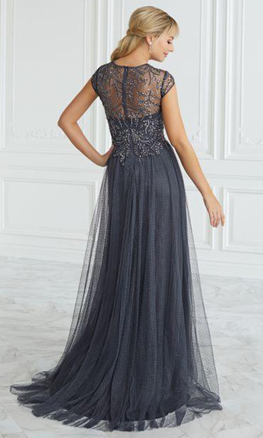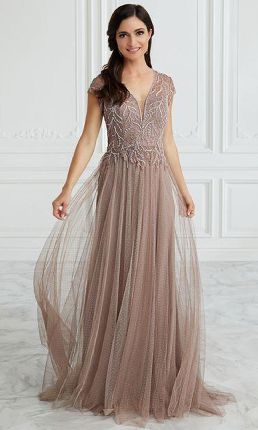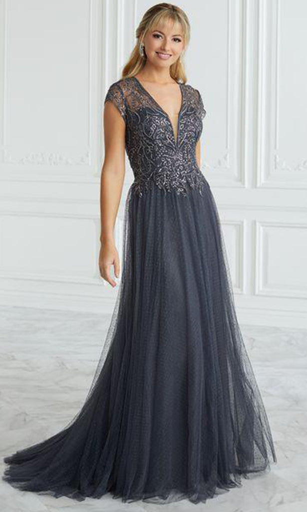 Make it your moment to stand out wearing this Christina Wu Elegance 17091 creation. Delicately decorated with intricate beadwork, this piece showcases an illusion short sleeve and plunging V-neckline with sheer inset detail at the bust and sweetheart lining. The sheer full back is enclosed with a center zipper closure detail. Finished with a beautiful sweeping train, the skirt is tailored with a dotted swiss mesh and it parades a full length A-line silhouette. Unleash an inner glamour that attracts all eyes on you in this Christina Wu Elegance masterpiece. Models are wearing the Charcoal and Mink colors.