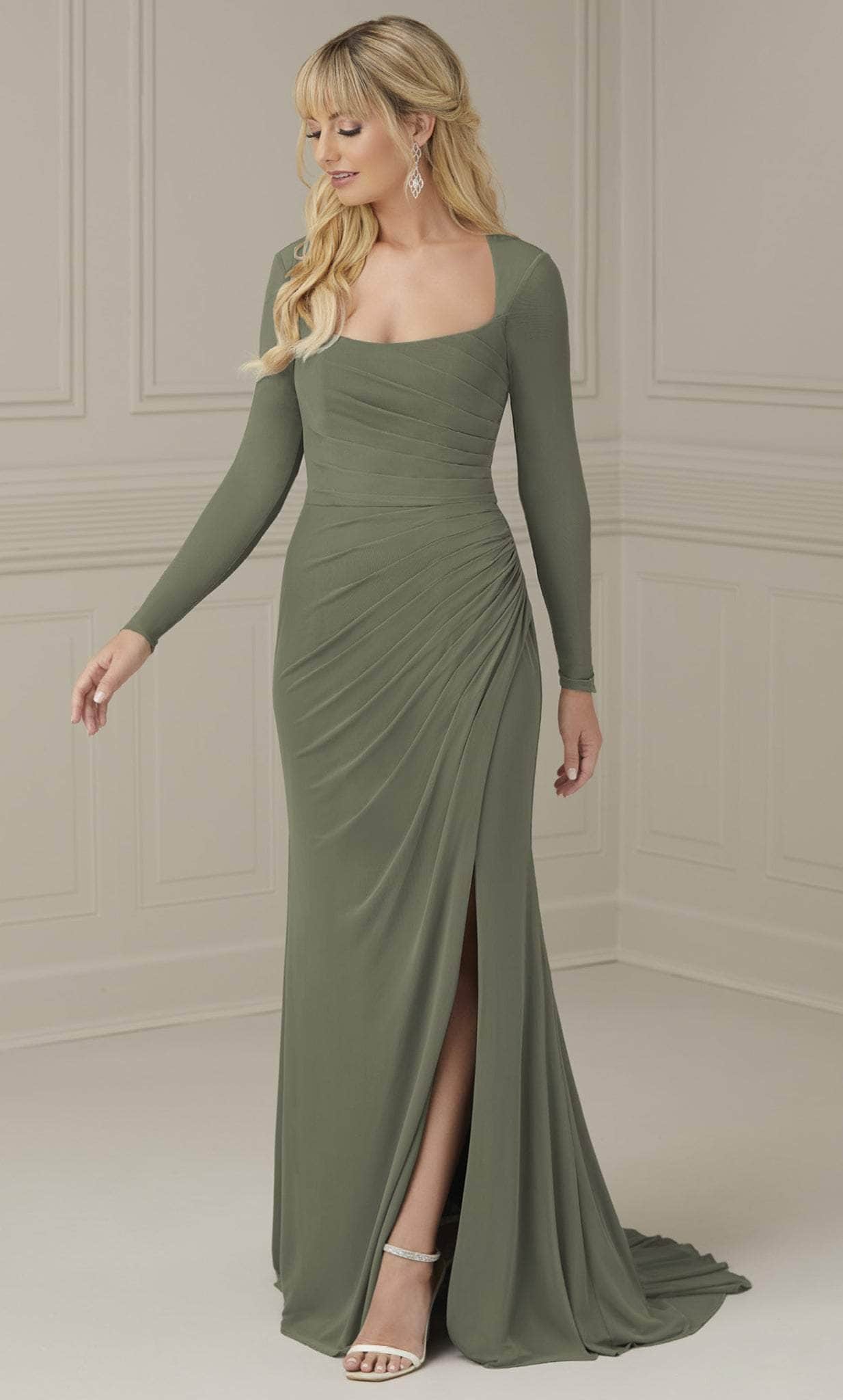 Have confidence that your grand entrance will be captivating in this Christina Wu Elegance 17101 creation. Styled with sculpting seams flaunting a figure flattering form, this dress parades a square neckline and framed with sheer long sleeves. Featuring a sheer back with a concealed zipper closure, accented with soft drapes and a high slit, the sheath skirt streams to the floor with a trailing train. Set a style that would engage everyone in this enchanting Christina Wu Elegance creation. Models are wearing the Black, Navy, Platinum, and Sage colors.