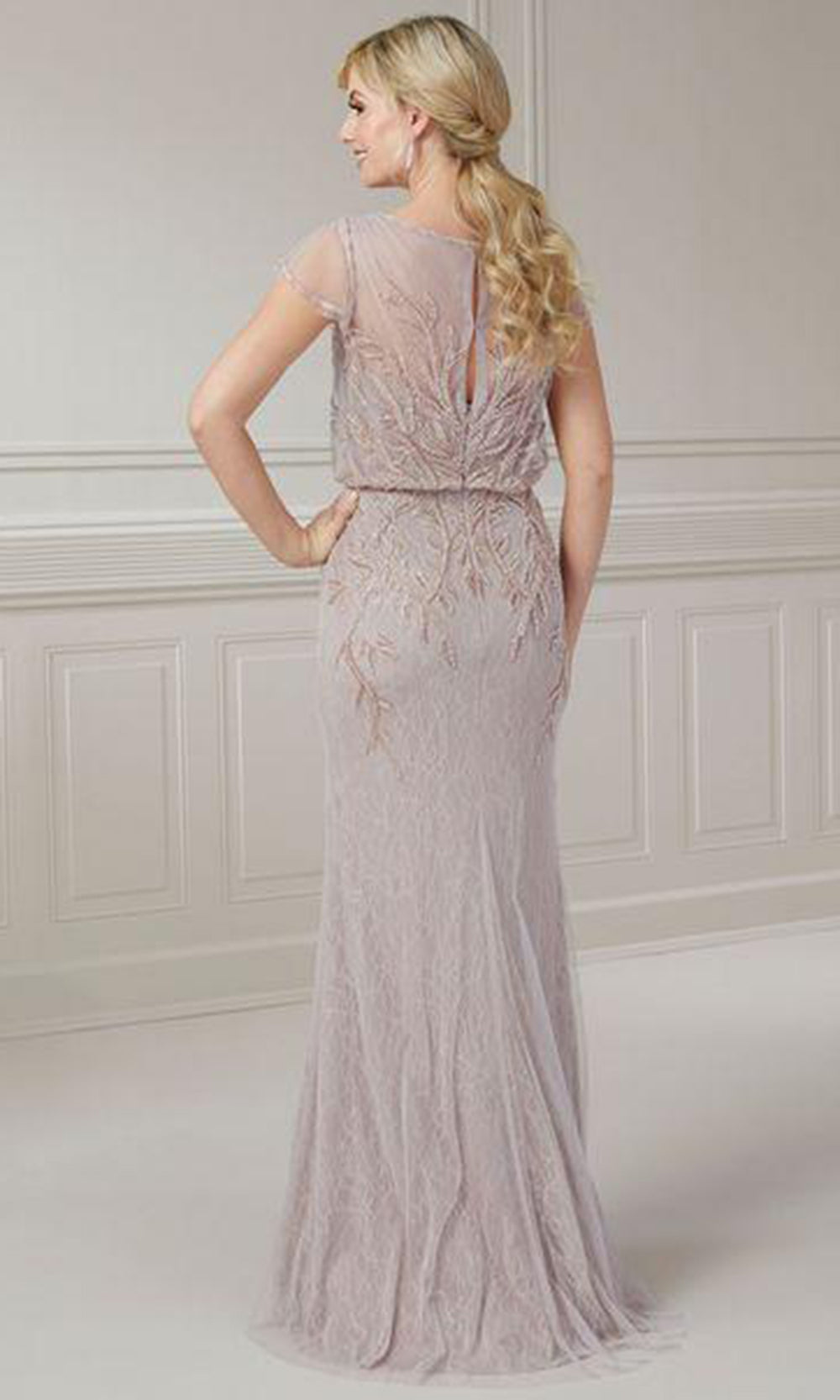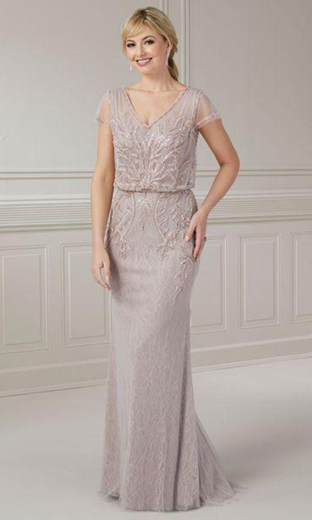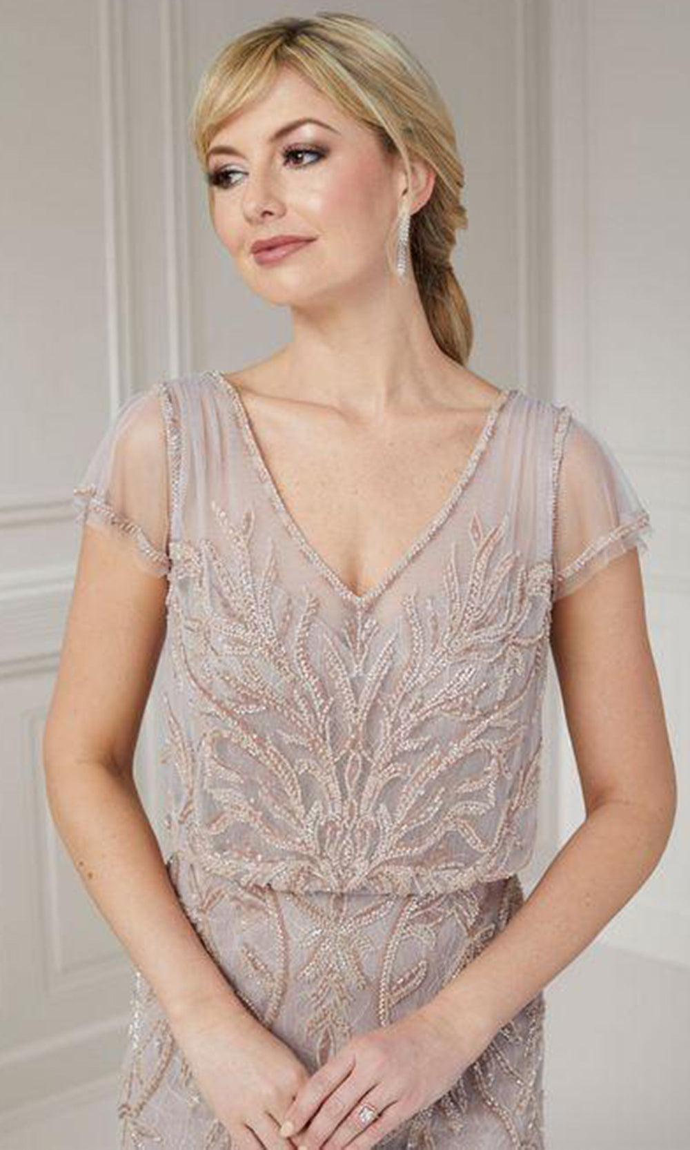 Go for a timeless and stylish look wearing this creation by Christina Wu Elegance 17122. Gorgeous in a blouson bodice with beadwork and lace underlayer, this style is simply eye-catching. It has a v-neckline, sheer short sleeves and a keyhole back. The skirt gracefully flows to the full length sheath silhouette and exits in a slight sweep train. This Christina Wu Elegance 17122 masterpiece is specially designed to make that special occasion worth reminiscing. Model is wearing the Truffle color.