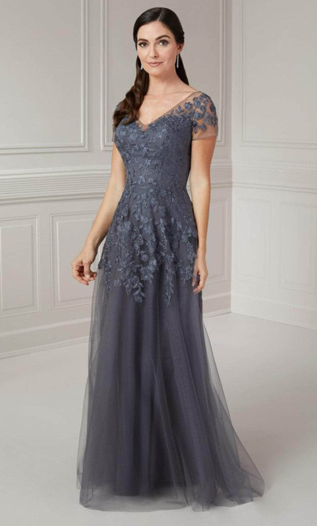 Be charmed with the timeless beauty of this Christina Wu Elegance 17135 masterpiece. Adorned with floral embroidery, this gown is created from tulle fabric and is a must-have at your next special event. The top has an illusion detail with mirrored v-neckline and v-back, as well as short sleeves for support. From the natural waist, the A-line skirt glides into the floor with a sweeping train ending. Leave everyone speechless when you enter the room in this Christina Wu Elegance 17135 creation. Model is wearing the Gunmetal color.