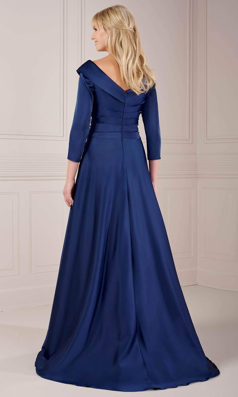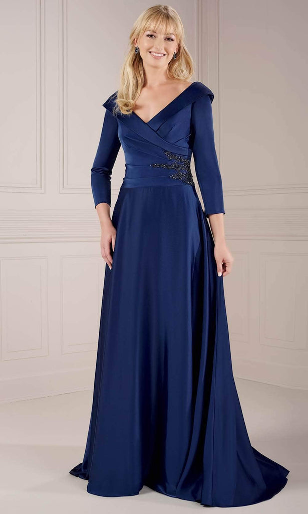 Enhance your exquisite silhouette with the embodiment of grace embodied in the Christina Wu Elegance 17144 creation. Crafted with a stunning A-line profile, this skillfully tailored ensemble crafts from a charmeuse fabric with precise tailoring. This ensemble boasts a portrait v-neckline, elegantly bordered by a subtle collar. The bodice showcases meticulous side pleating, adorned with a tasteful beaded accent at the left waist, while three-quarter sleeves add a touch of sophistication. The ensemble forms a blend of seamless design and with down to its sweeping denouement. Illuminate the evening, setting yourself apart as you twirl and dance throughout the night in the Christina Wu Elegance 17144 masterpiece. Model is wearing the Navy color.