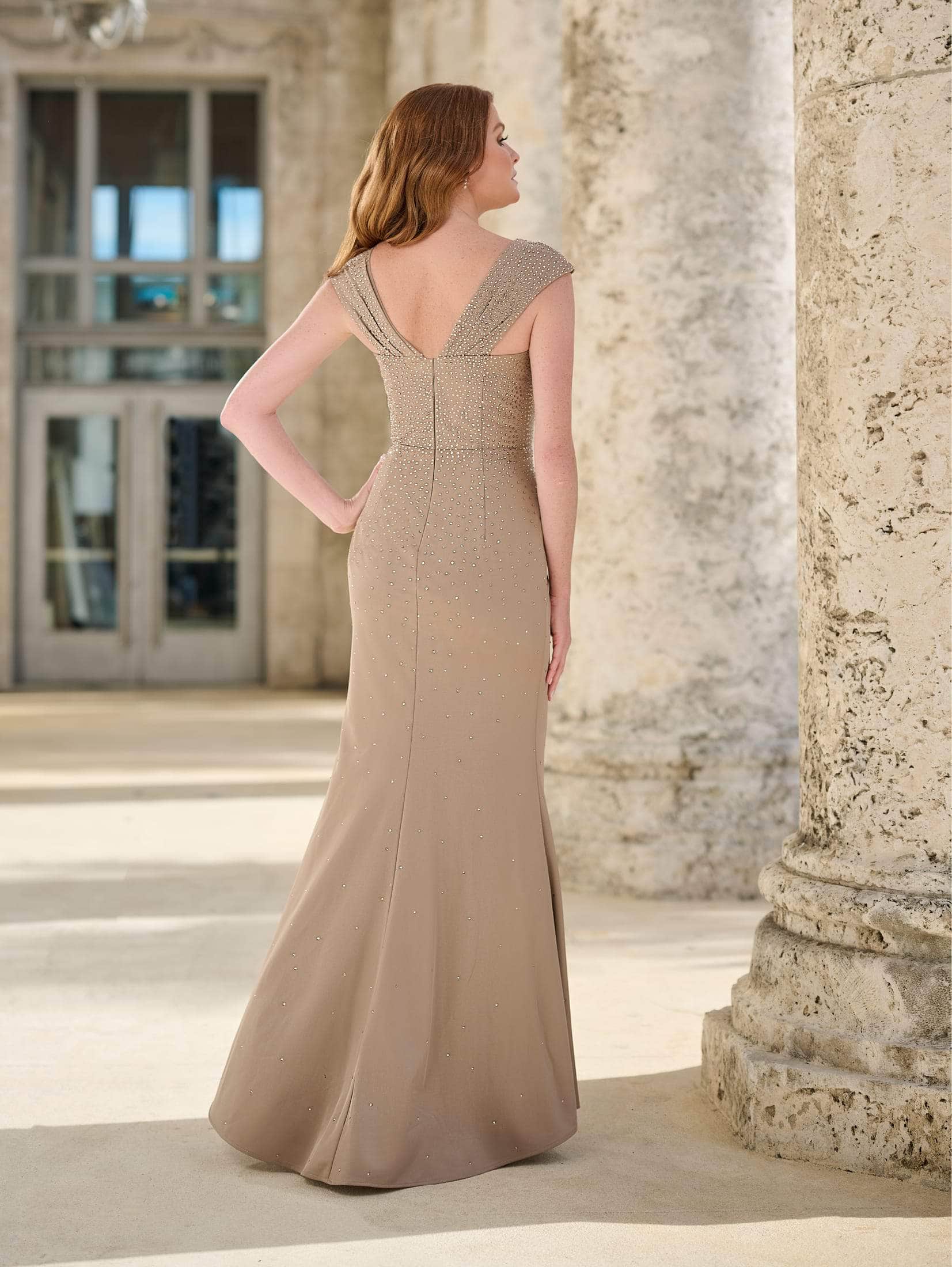 Embrace sophistication with the Christina Wu Elegance 17161 gown, a sleek masterpiece designed to captivate. Crafted from luxurious jersey fabric adorned with tonal hit stones, this slim style exudes understated glamour. The gown features an asymmetrical neckline with elegant draping on the straps, while side pleating on the bodice adds dimension and allure. Finished with a short sweep on the left side hip area, the ensemble showcases modern asymmetry. Secured with an invisible zipper closure at the back, the gown ensures a flawless fit. Complete with a short sweep train, this gown epitomizes contemporary elegance, making it perfect for any formal occasion. Experience timeless allure with Christina Wu Elegance 17161. Model is wearing the Latte color.