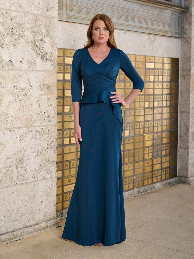 | Details: | Quarter-Length Sleeve, Pleated Bodice, Asymmetric Peplum, V-Back, Back Zipper, Floor Length |