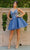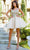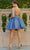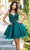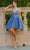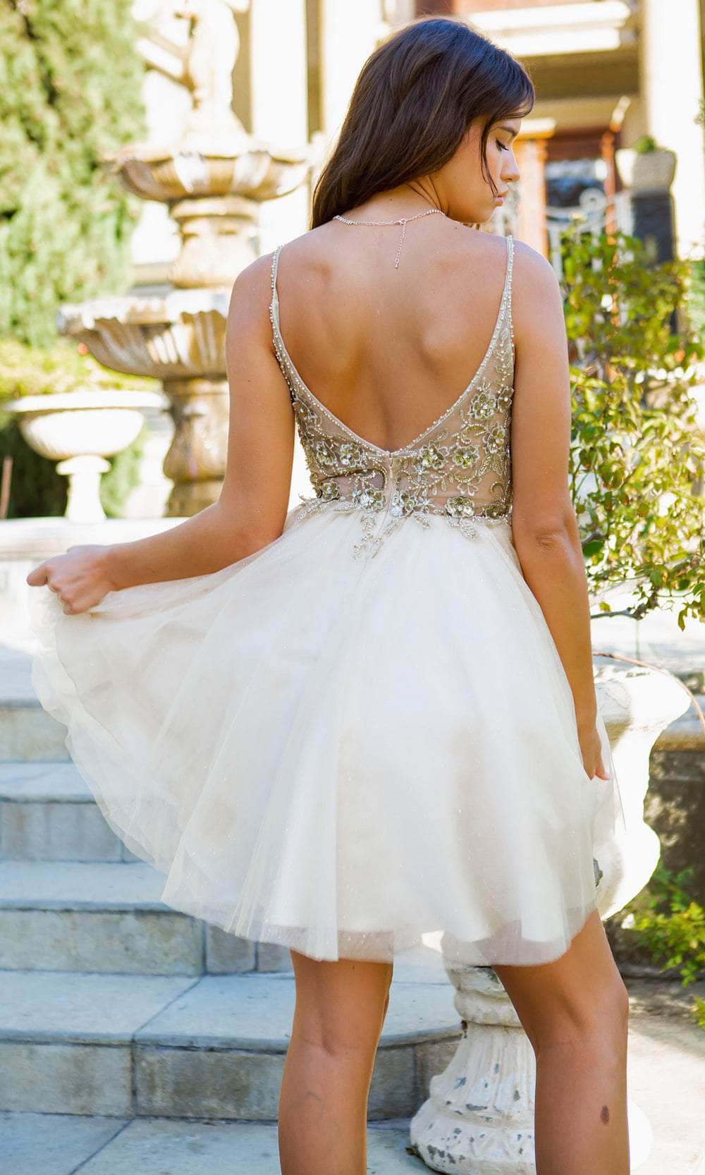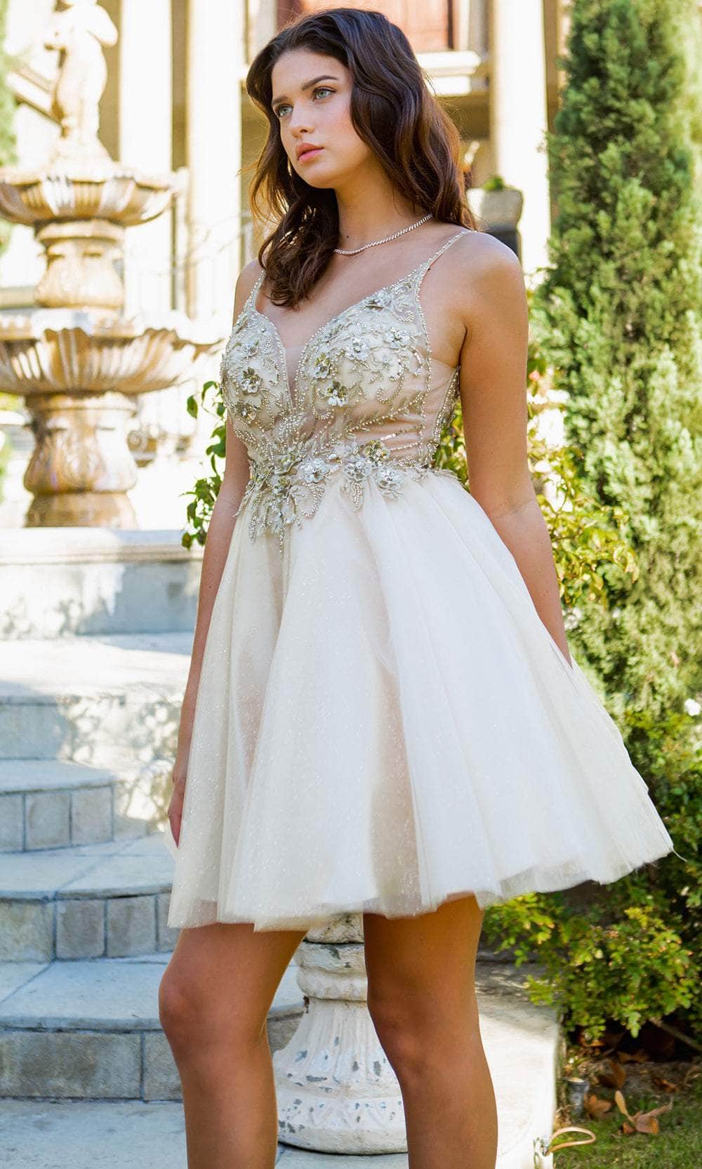 Make a statement in this lovely party dress by Cinderella Couture 5112J. Adorned with intricate floral lace applique and sparkling beaded rhinestones, this sleeveless design is sure to steal the spotlight. The alluring illusion corset bodice consists of exposed boning, a plunging v-neckline, and a low v-open back. Crafted from glitter tulle, the layered skirt adds dimension to the A-line silhouette and finishes with a beautiful short hemline. Go girl and celebrate! Have fun in Cinderella Couture 5112J creation. Models are wearing Blush, Champagne, Hunter Green, and Smoky Blue colors.