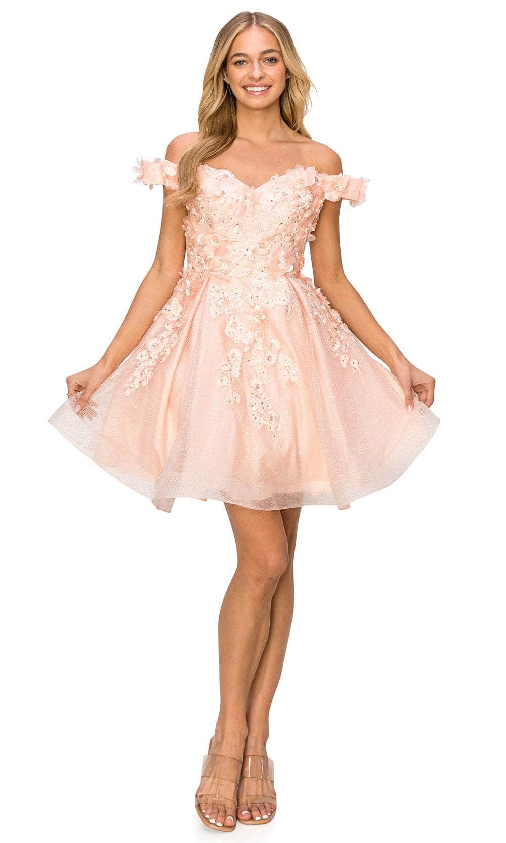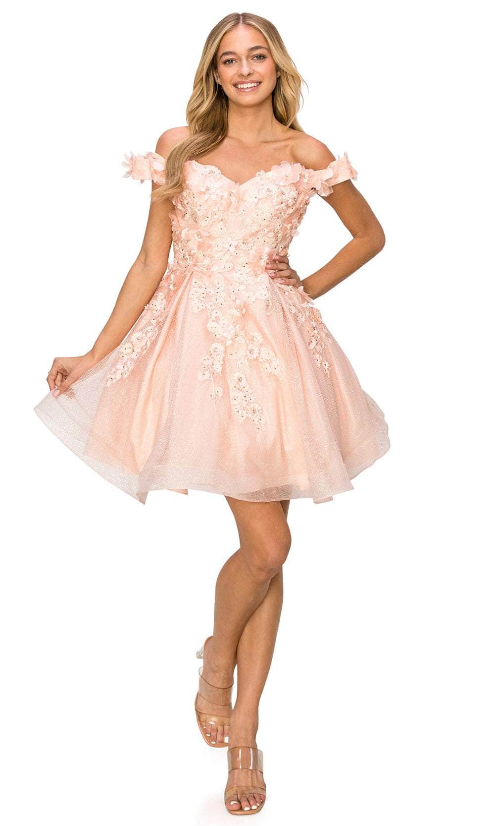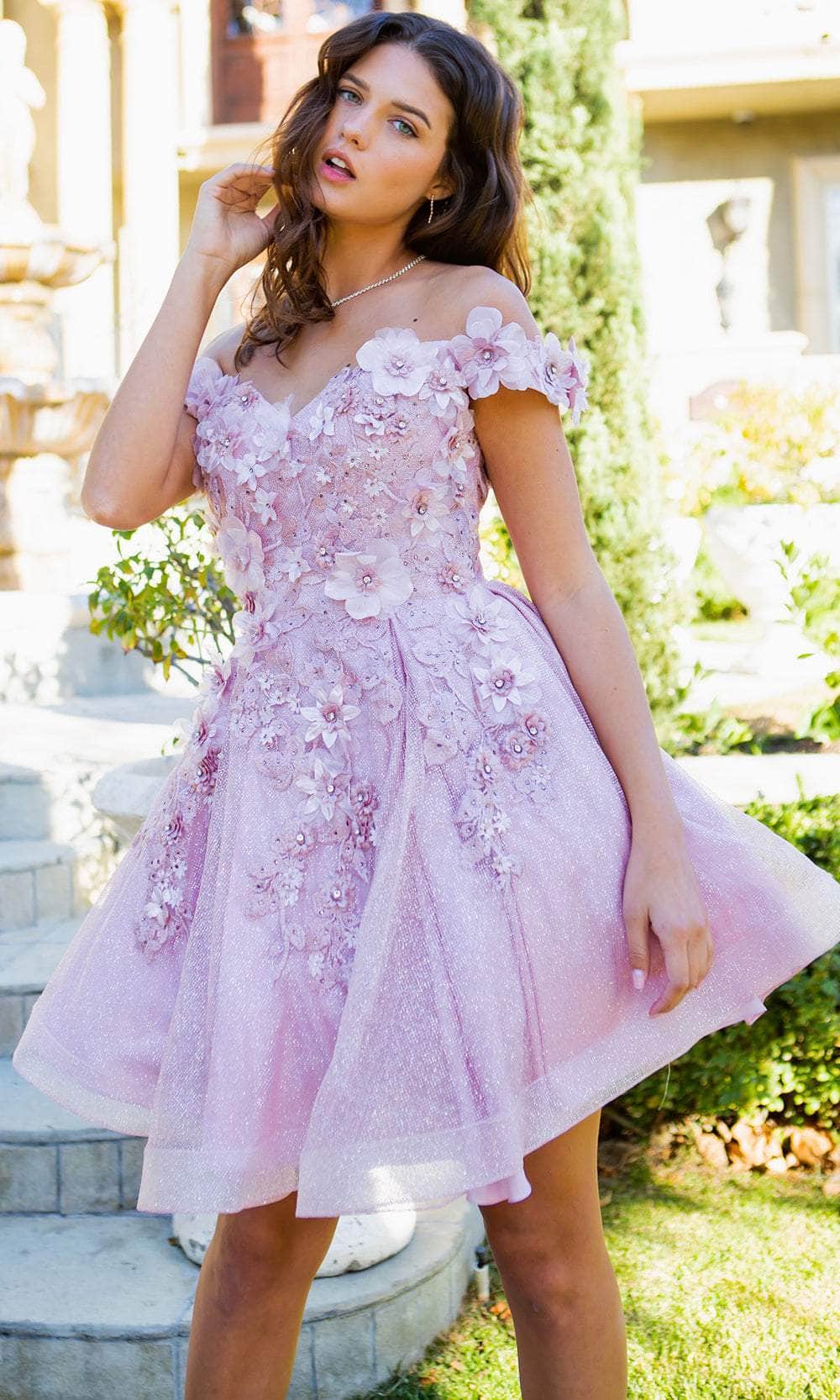 Unleash your inner beauty and radiate confidence in this Cinderella Couture 5120J masterpiece. The dress is decorated with embroidery, 3D floral appliques, and beading that gives it a charming, feminine touch. It showcases an off-shoulder sweetheart, cap sleeves, and a midrise back with lace-up closure. The pleated A-line skirt gracefully flows to the short hemline, enhanced with a horsehair trim. Dance and enjoy your next special party or event in this short, sassy, and stylish dress by Cinderella Couture 5120J. Models are wearing Blue, Blush, Dusty Rose, Green Hunter, Lilac, and Red colors.