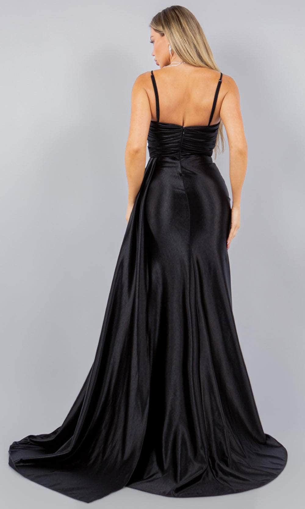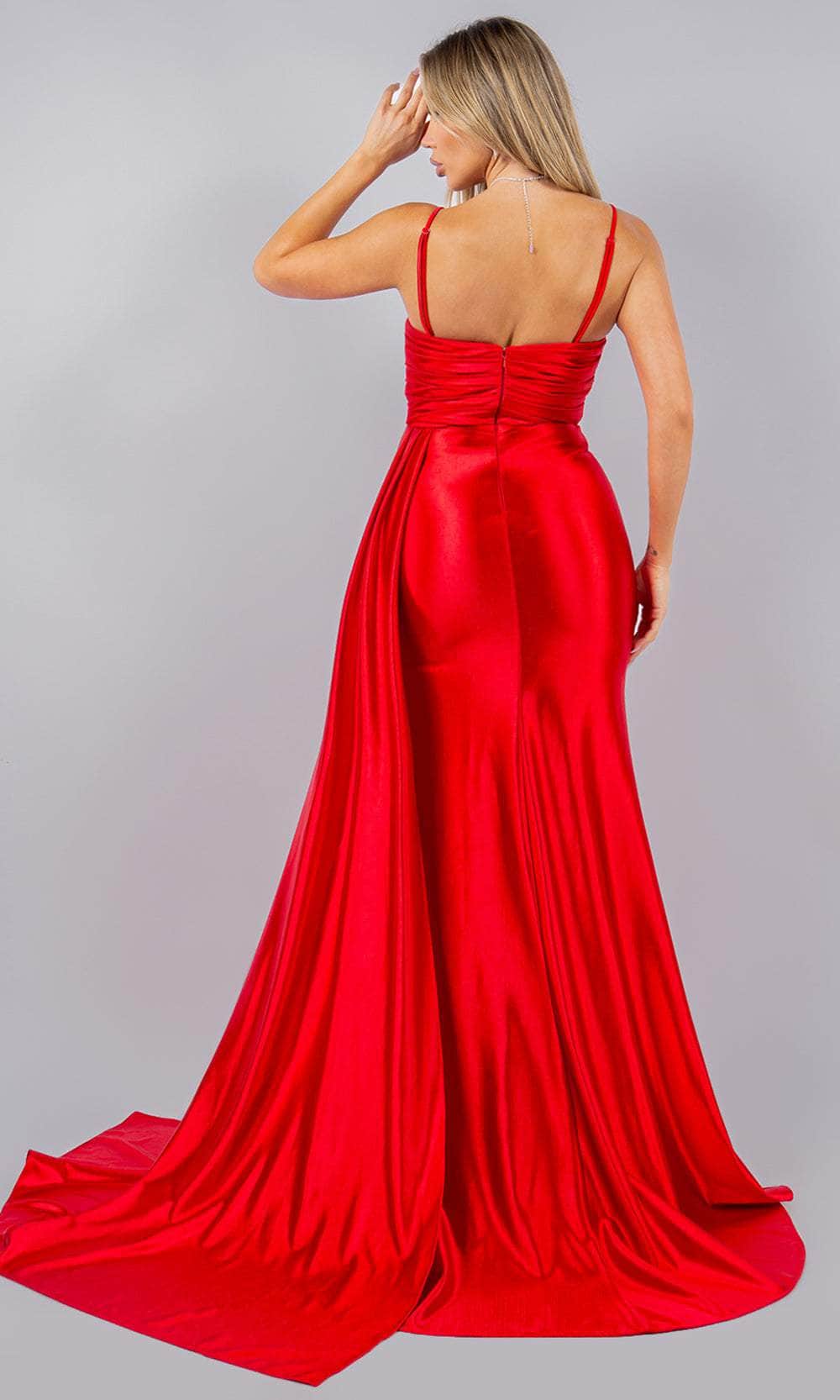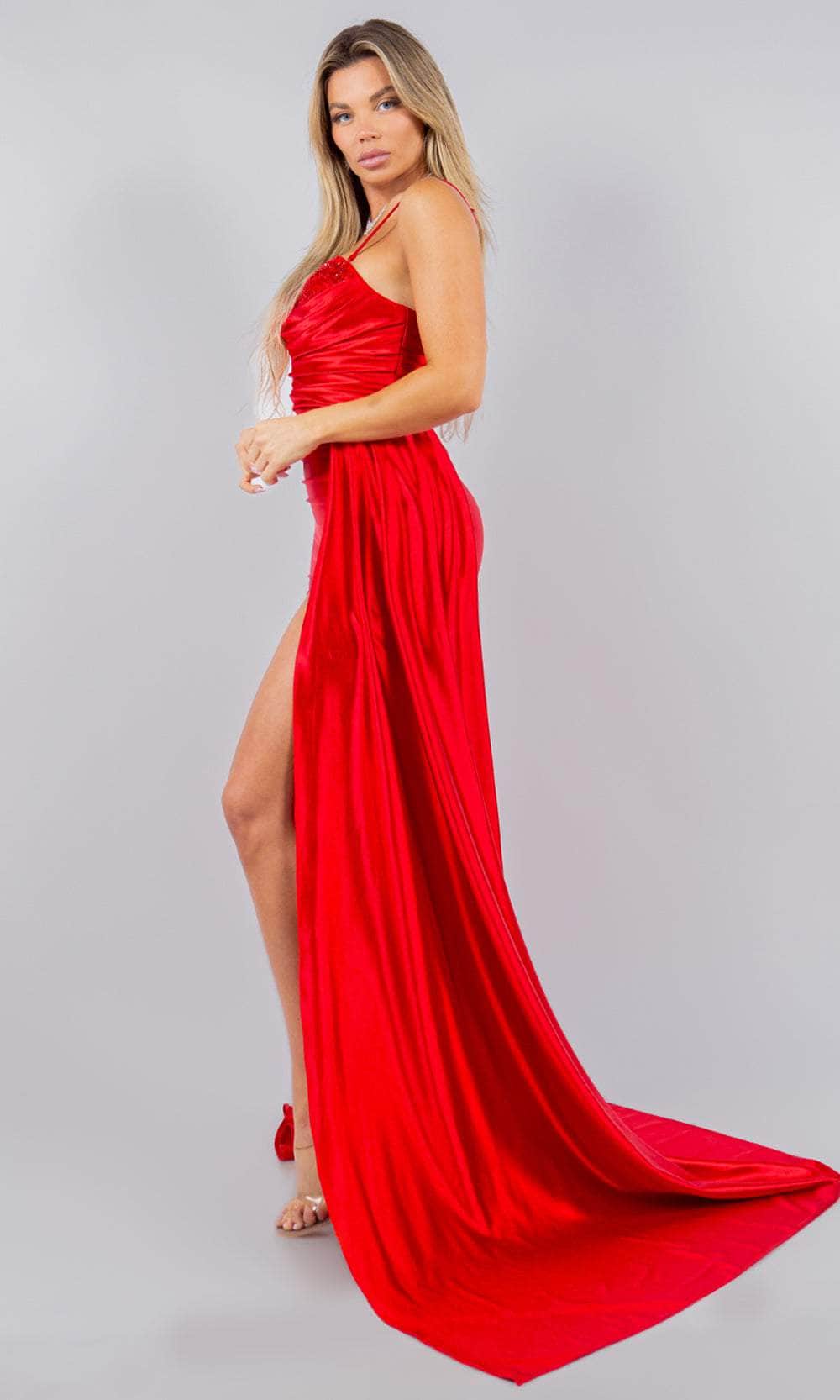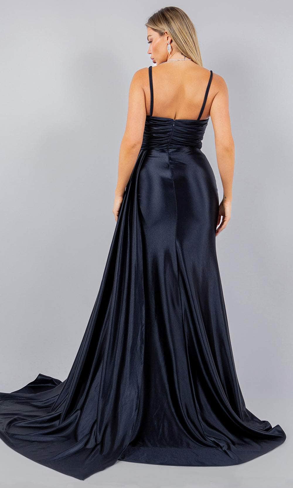 Take the elegance of your prom night to the next height with this Cinderella Couture 8082J masterpiece. This strapless piece showcases an exquisitely ruched and beaded lace boning bodice that effortlessly sculpts your figure. It features a sweetheart neckline, a straight mid-open back, and versatile detachable spaghetti straps. The side draping sash lends a dramatic and unique statement, while the skirt parades a full-length sheath silhouette. A thigh-high leg slit and sweeping train complete the look. This Cinderella Couture 8082J gown will not let anyone miss your grand entrance. Models are wearing Black, Fuchsia, Midnight Navy, and Red colors.