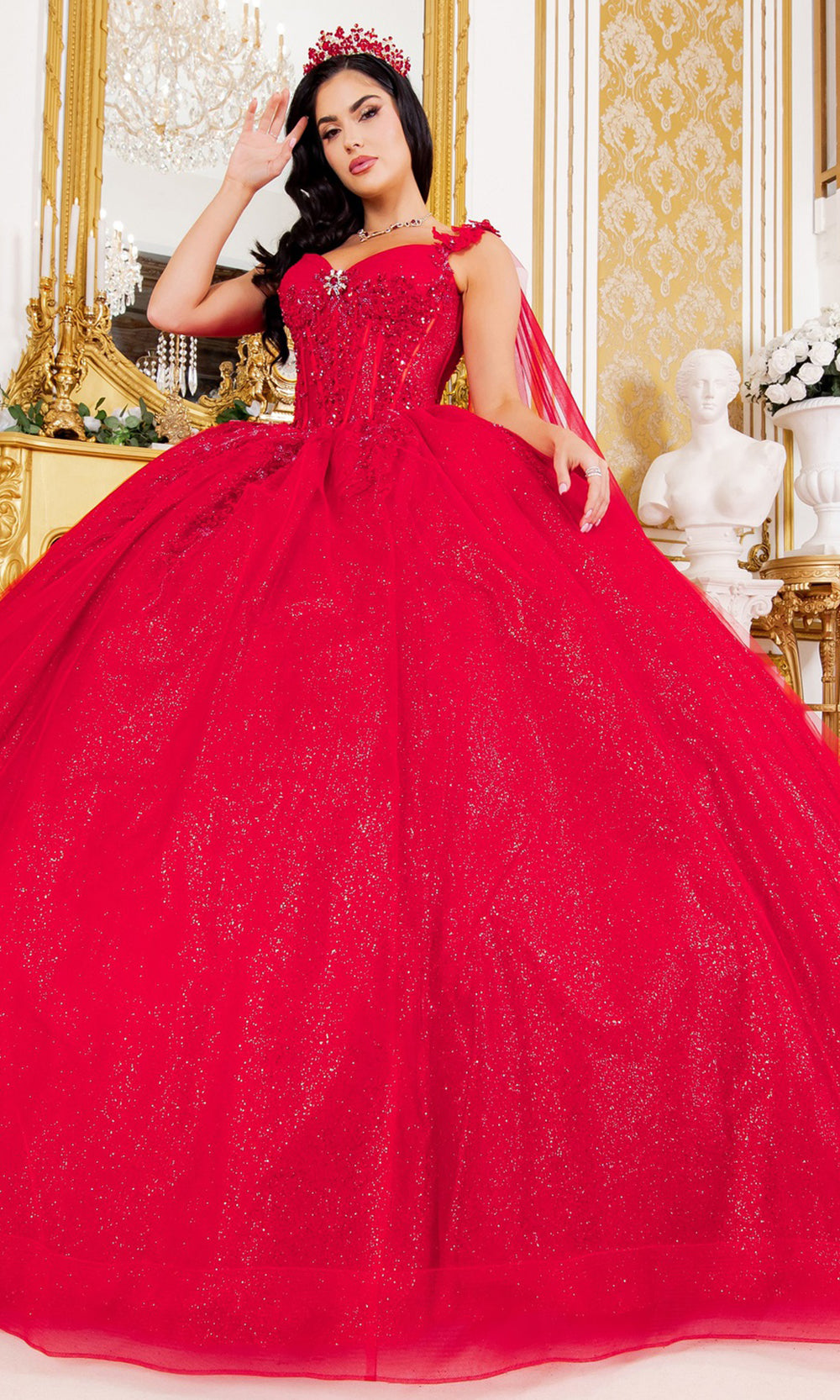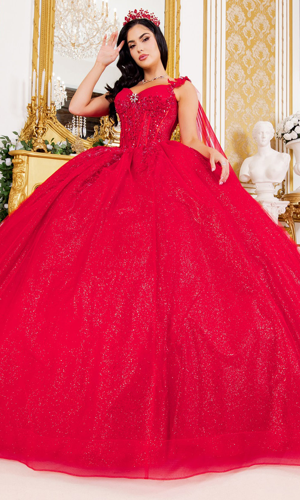 A gown of striking elegance, Cinderella Couture 8270J embodies romantic beauty in every detail. Its off shoulder sleeves frame the sweetheart neckline, creating a graceful silhouette that feels timeless. The tulle ballgown skirt is enhanced with exquisite embroidered applique and sequin detailing, flowing into a chapel train that adds majestic drama. With sheer cape attached to the shoulders, this gown ensures a look of grandeur and sophistication. Cinderella Couture 8270J is the ideal expression of classic glamour blended with enchanting design. Models are wearing Red, and Rosegold colors.