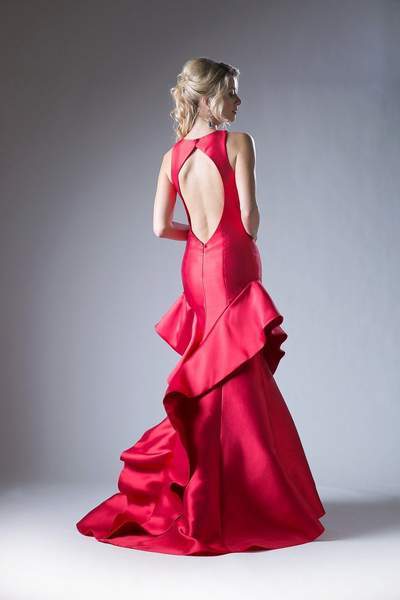 | Details: | Sleeveless, Illusion Notch, Seams, Cut-In Details, Ruffled Symmetrical Cascade, Deep Keyhole Cutout, Back Zipper Closure, Sweep Train |