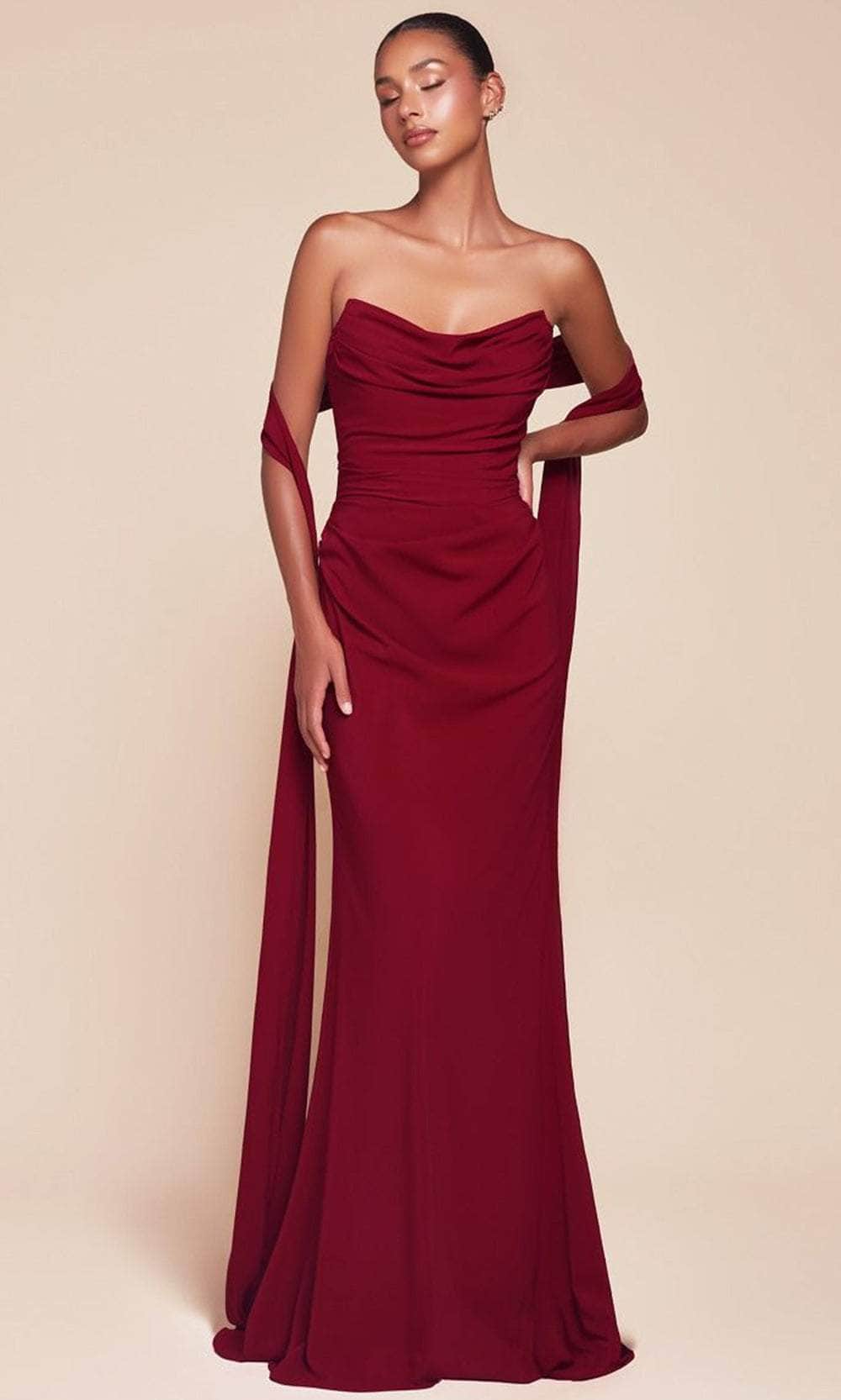 Step into elegance with a Cinderella Divine 7433 gown, blending luxury with modern design. This strapless fitted dress, crafted from luxe fabric and lining, showcases a classic scoop neckline and a gathered bodice for a figure-flattering fit. The elegant transitional ties under the arm add a touch of versatility, enabling multiple styling options. Made from soft chiffon, the gown features a structured bodice that provides excellent support and enhances your natural shape. A sweeping train adds a graceful finish to this sophisticated piece. Perfect for bridesmaids, wedding guests, or black-tie events, this gown embodies timeless charm and refined elegance. Be the center of attention in the Cinderella Divine 7433 gown. Models are wearing the Black, Burgundy, Dusty Rose, and Dusty Sage colors.