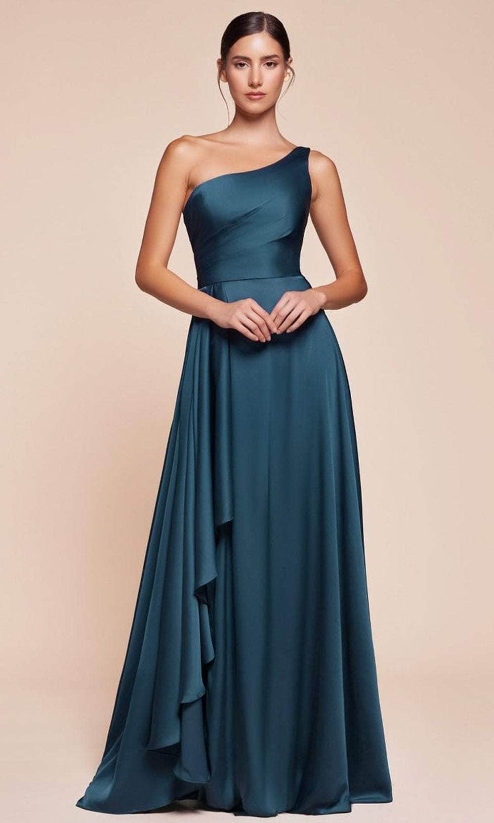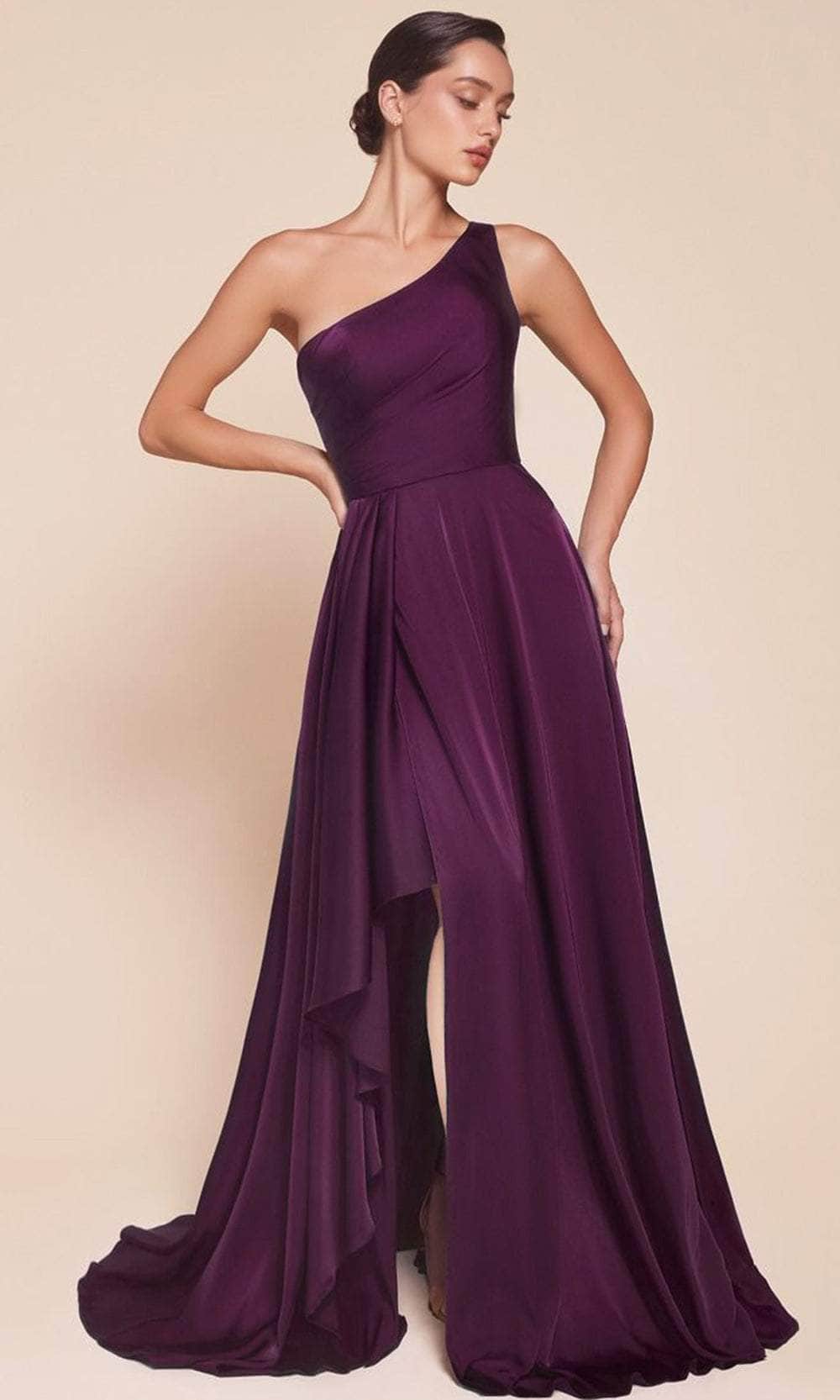 Enhance your evening in a Cinderella Divine 7450 gown, where timeless elegance is paired with modern sophistication. Designed with flawless tailoring on luxurious fabric and lining, this A-line gown exudes grace and style. The sleeveless bodice features a one-shoulder neckline, complemented by a dramatic open back with delicate thin straps. The soft satin fabric flows into an asymmetrical skirt, adding movement and fluidity to the design. The fitted bodice highlights the graceful silhouette, making this gown ideal for bridesmaids, wedding guests, or any formal event. Let your elegance shine in the Cinderella Divine 7450 gown, a perfect choice for any refined occasion. Models are wearing the Black, Eggplant, Emerald, French Navy, Mauve, and Smokey Blue colors.