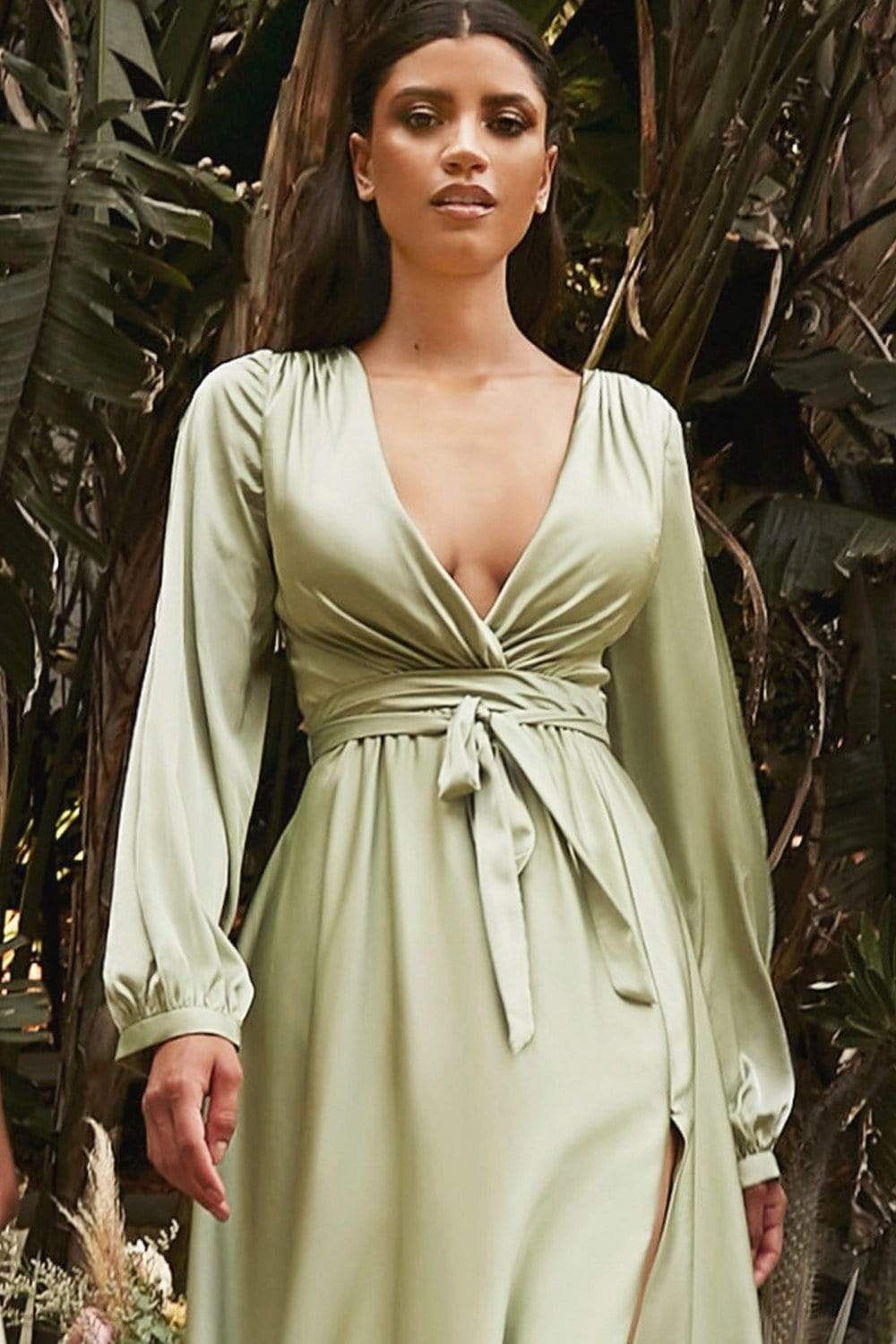 | Details: | Split Bishop sleeves, Plunging neckline, V back, Set-on waistband, High leg slit, Hidden back zipper |