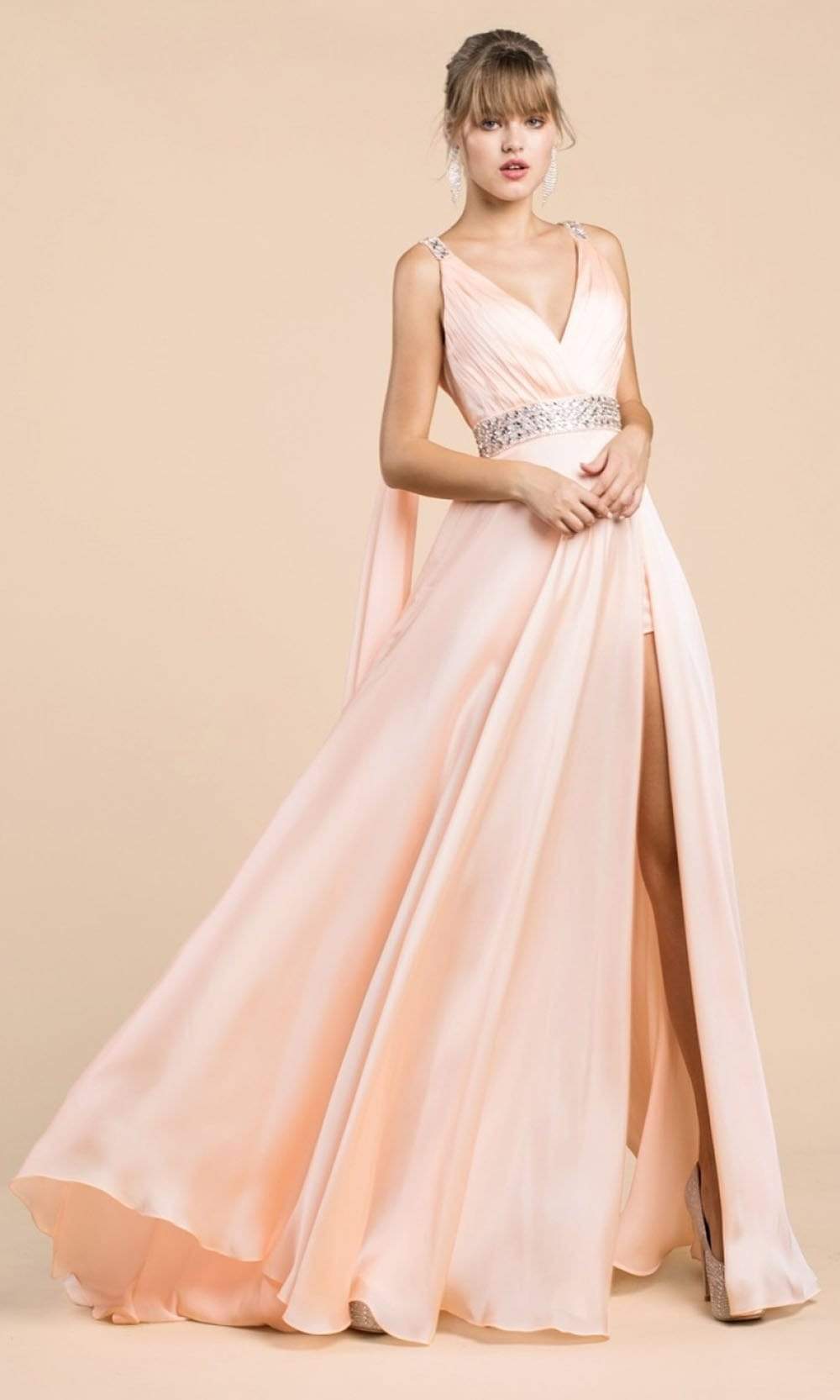 | Details: | Satin fabric, Sleeveless, Beaded shoulder strap and waistband, Shoulder cape, High Slit, Mini-length inner skirt, Low V back, Hidden back zipper |
