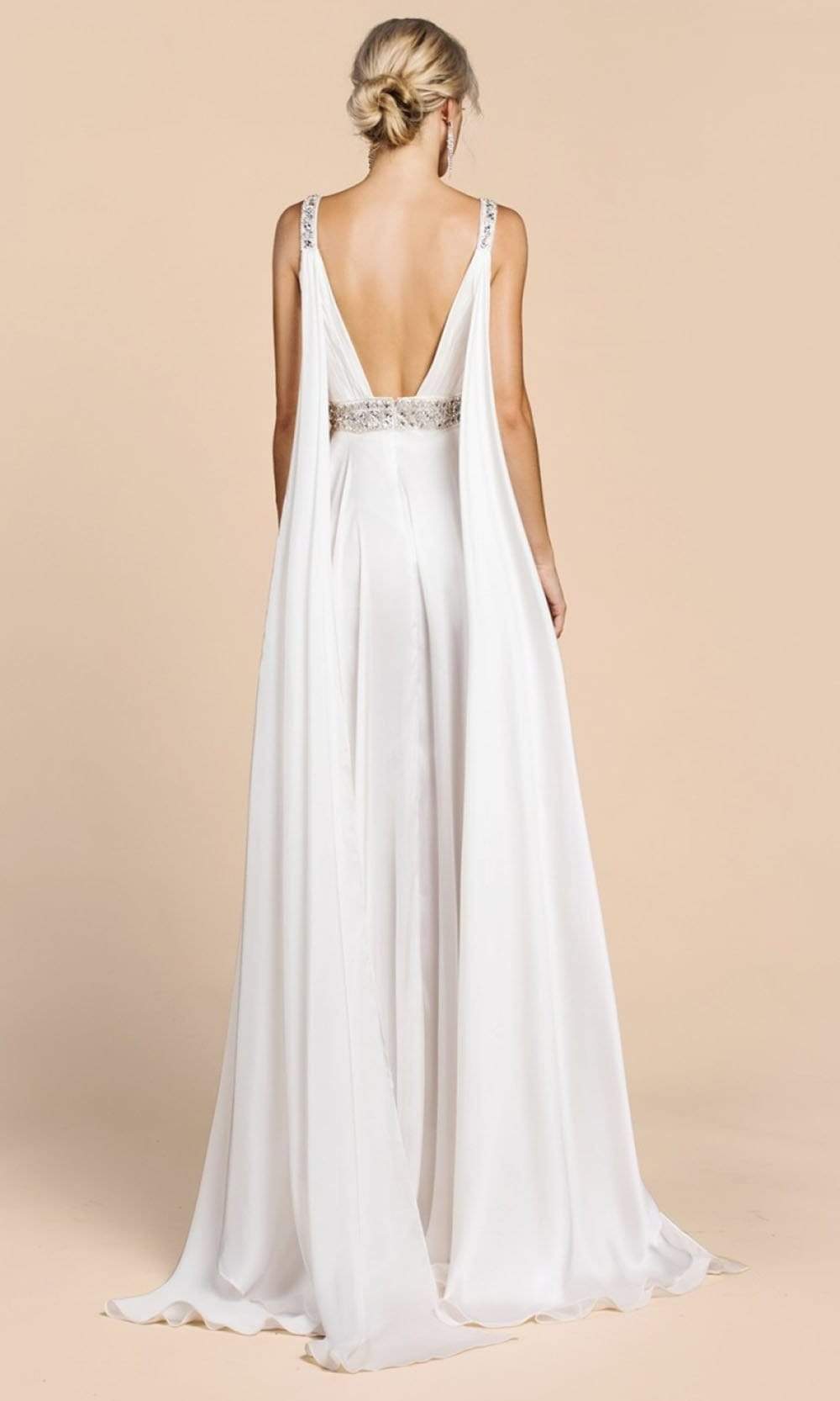 Create an incredible entrance and leave a lasting impression in Cinderella Divine A0065. Draped in luxurious satin, this stunning evening gown showcases a sleeveless surplice bodice while the open back shows off a V-shape. The gown glistens with its embellished straps and waistband while dramatic long cape flows from each side of the shoulder. The gowns skirt gorgeously flourishes in full-length with sky high slit to reveal that mini-underskirt underneath. Sexy and sophisticated is the way to go in this glamorous Cinderella Divine creation.