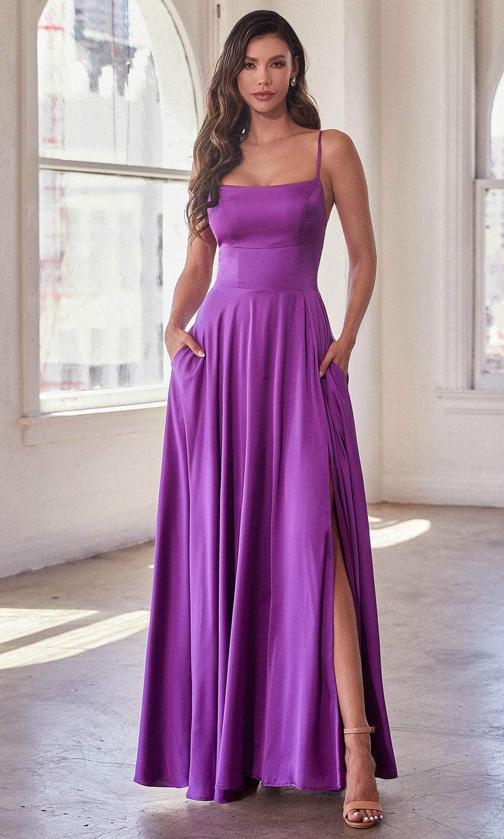 Exude elegance and style in this Cinderella Divine B8402 gown. Crafted from luxurious satin, this sleeveless dress is simple yet refined, featuring a scoop neckline and a wide waistband. The adjustable spaghetti straps and lace-up corset back ensure a flattering and comfortable fit. The wrap-style A-line skirt cascades gracefully to the floor, revealing a high slit on the side for a touch of allure. Feel instantly enchanted the moment you wear this Cinderella Divine B8402 creation. Models are wearing Black, Blush, Burgundy, Emerald, French Navy, Lt Blue, Purple, Sienna, and Royal colors.