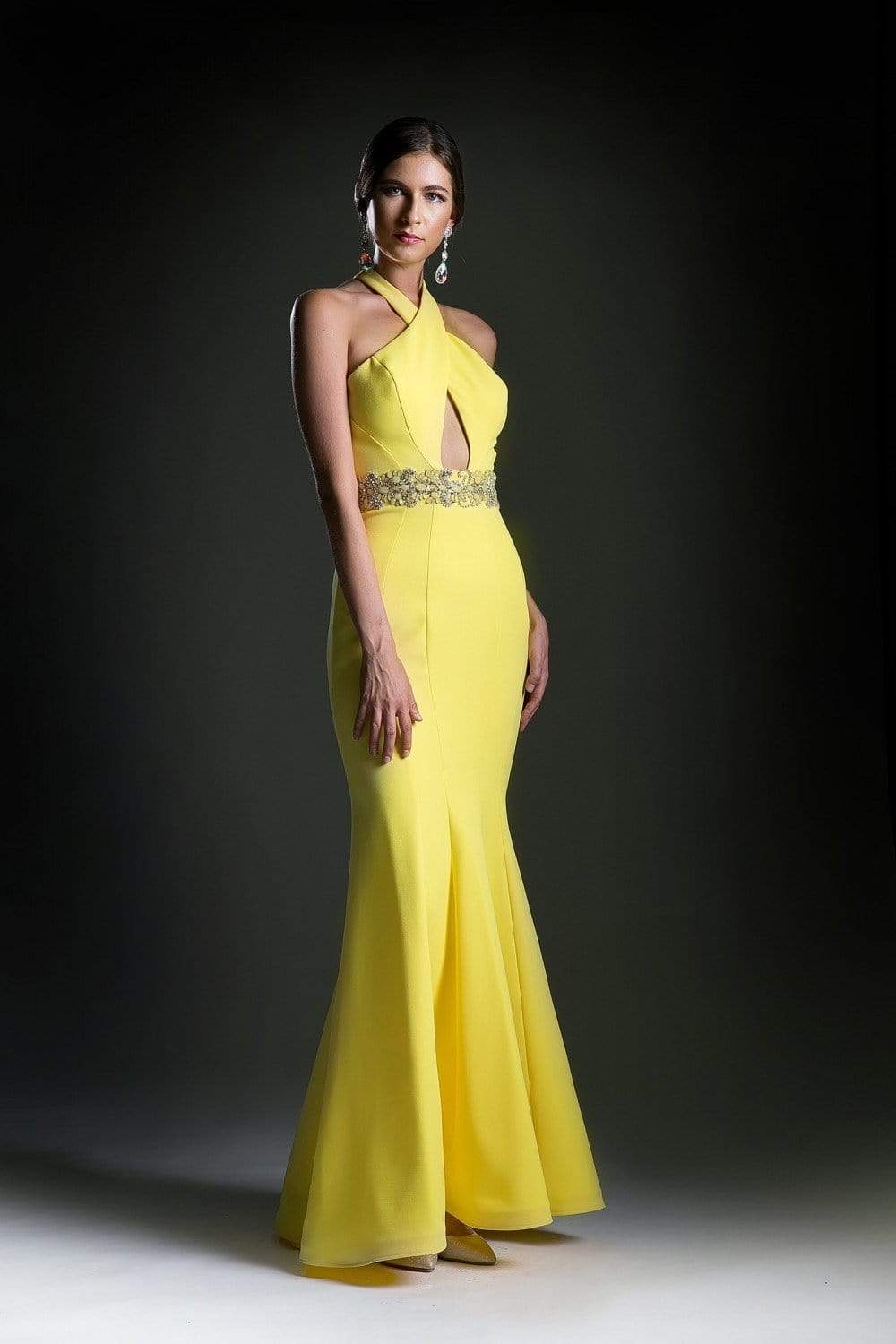 Captivate the crowd as you walk in this long formal dress by Cinderella Divine 11978. The fitted bodice features a sleeveless, halter neckline with a front cutout and an open back. The waist is accented with a beaded band and leads a full length mermaid skirt with sweep train. This scuba dress by Cinderella Divine is perfect for a standout style and flawless fit.