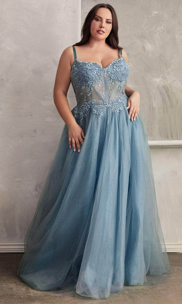 Be dressed up beautifully with this Cinderella Divine C150C, a stunning prom gown designed to captivate. The sleeveless sheer bodice, embellished with intricate embroidery, radiates elegance. A lace-up tie and central zipper closure at the back offer a secure and stylish fit. Flowing into a floor-length A-line skirt with a tasteful slit, this gown adds a touch of allure. Perfect for a memorable prom night, Cinderella Divine C150C provides a beautiful blend of sophistication and modern style. Models are wearing Blue, Dusty Teal, Emerald, Mauve, and Red colors.