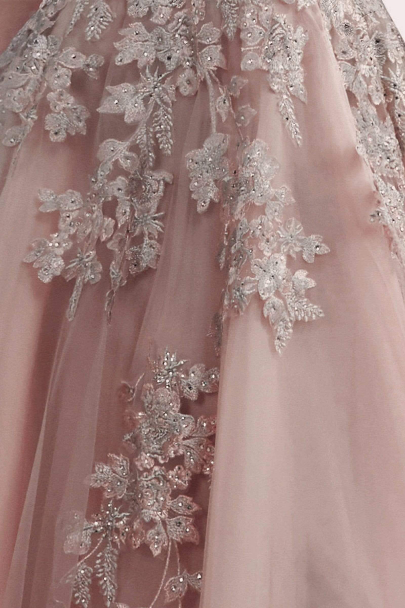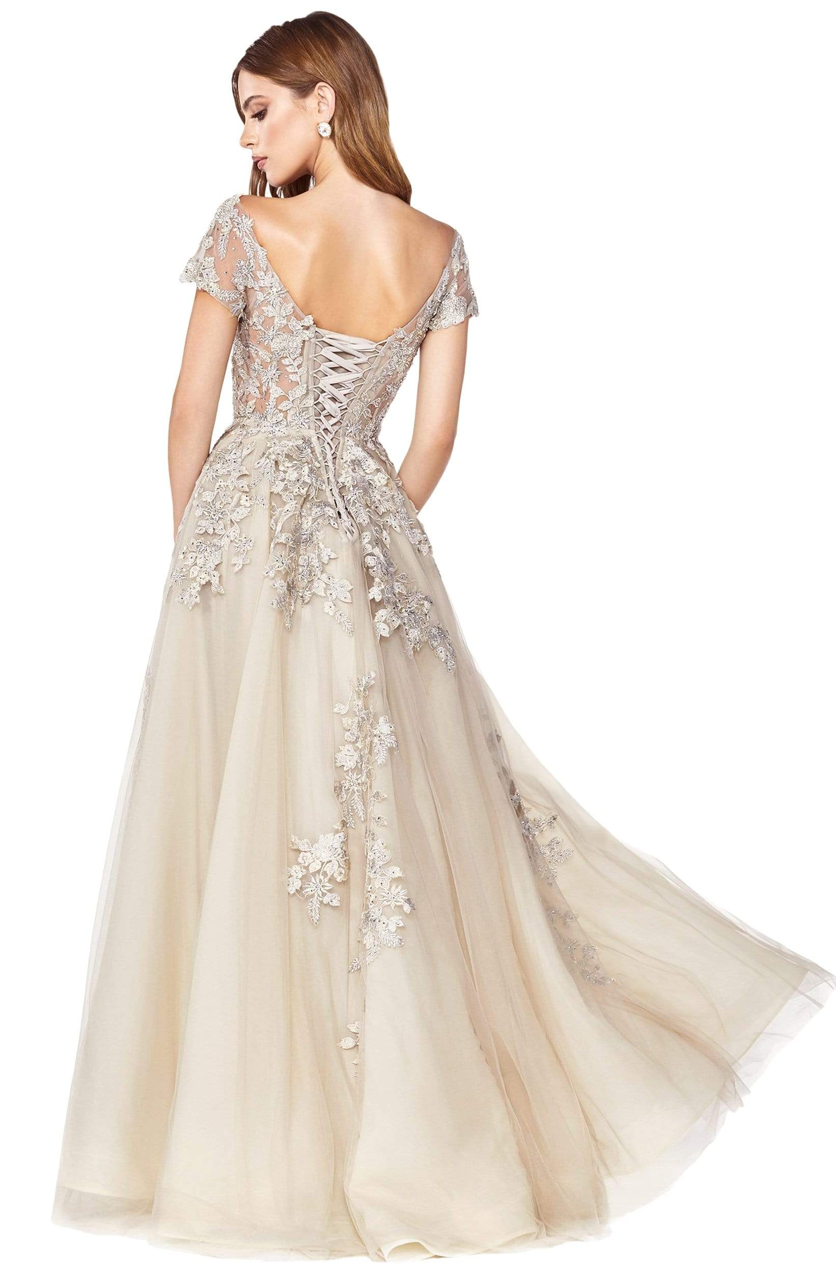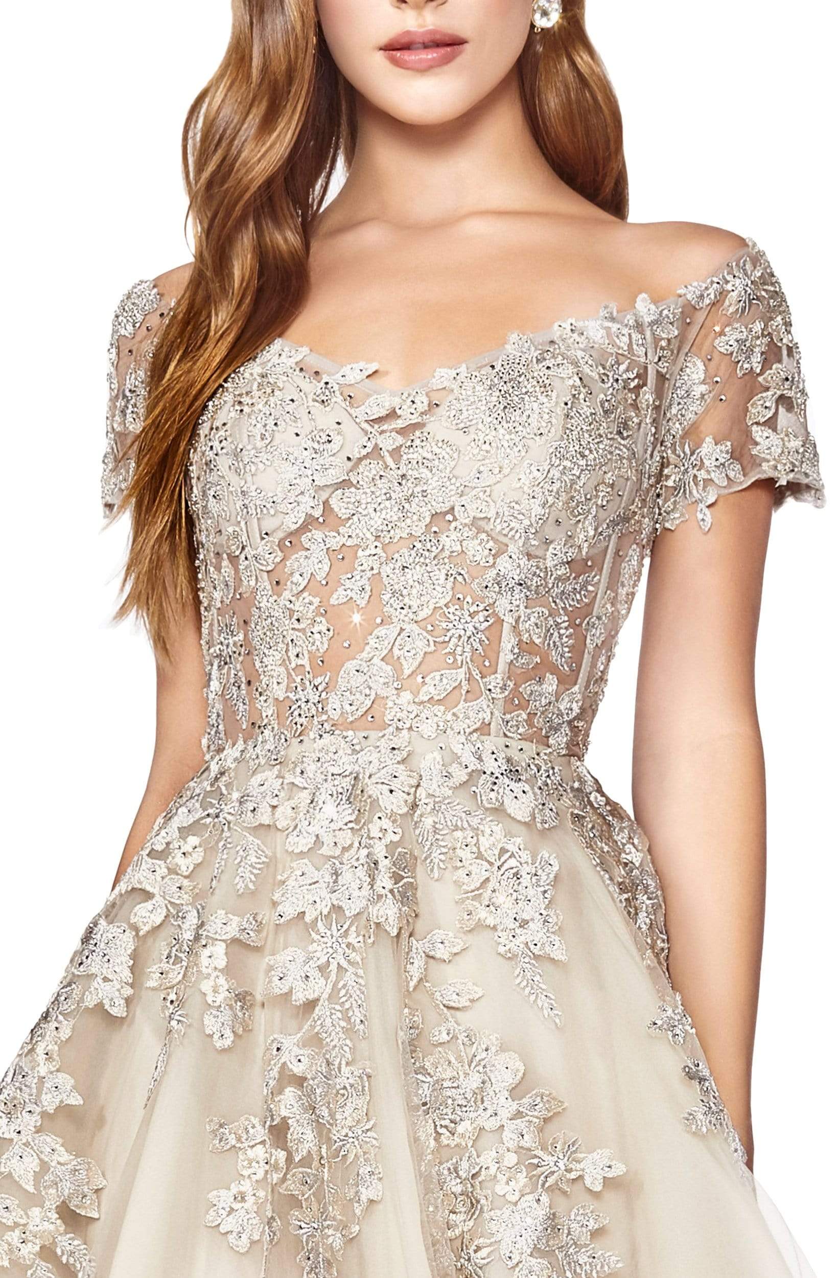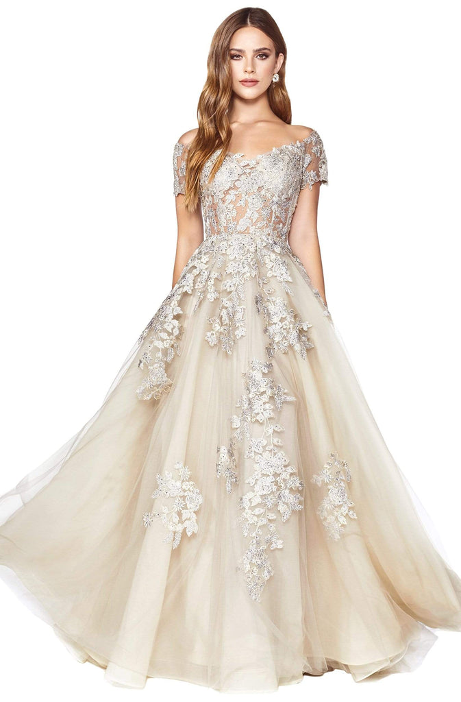 Impress everyone with the sheer romance of this Cinderella Divine C20 creation. Designed to flourish a trail of appliques and rhinestone ornaments, this stunner promotes an illusion off shoulder neckline with short sleeves. A corset back parades a scoop design. The A-line skirt streams with foliage adornments as it cascades into a trailing train. Walk into the ballroom and completely stun everyone in this Cinderella Divine masterpiece.