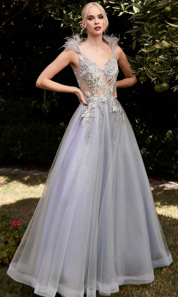 Embrace luxurious femininity in this enticing Cinderella Divine CB091 creation. Stunning applique embroideries festooned in sheer fabric; this gown showcases a plunging v-neckline with exquisite feather fringes on the shoulder strap. The back presents an open back design. The tulle skirt skims and flares into a full-length horsehair hemline. Walk down the red carpet in style in this Cinderella Divine. Whether you are looking for a unique prom dress to stand out, bridesmaid dresses or Mother of the Bride dress for that special day, or just an evening dress for a special night out, Cinderella Divine has your dress at the right price. Model is wearing Paris Blue color.