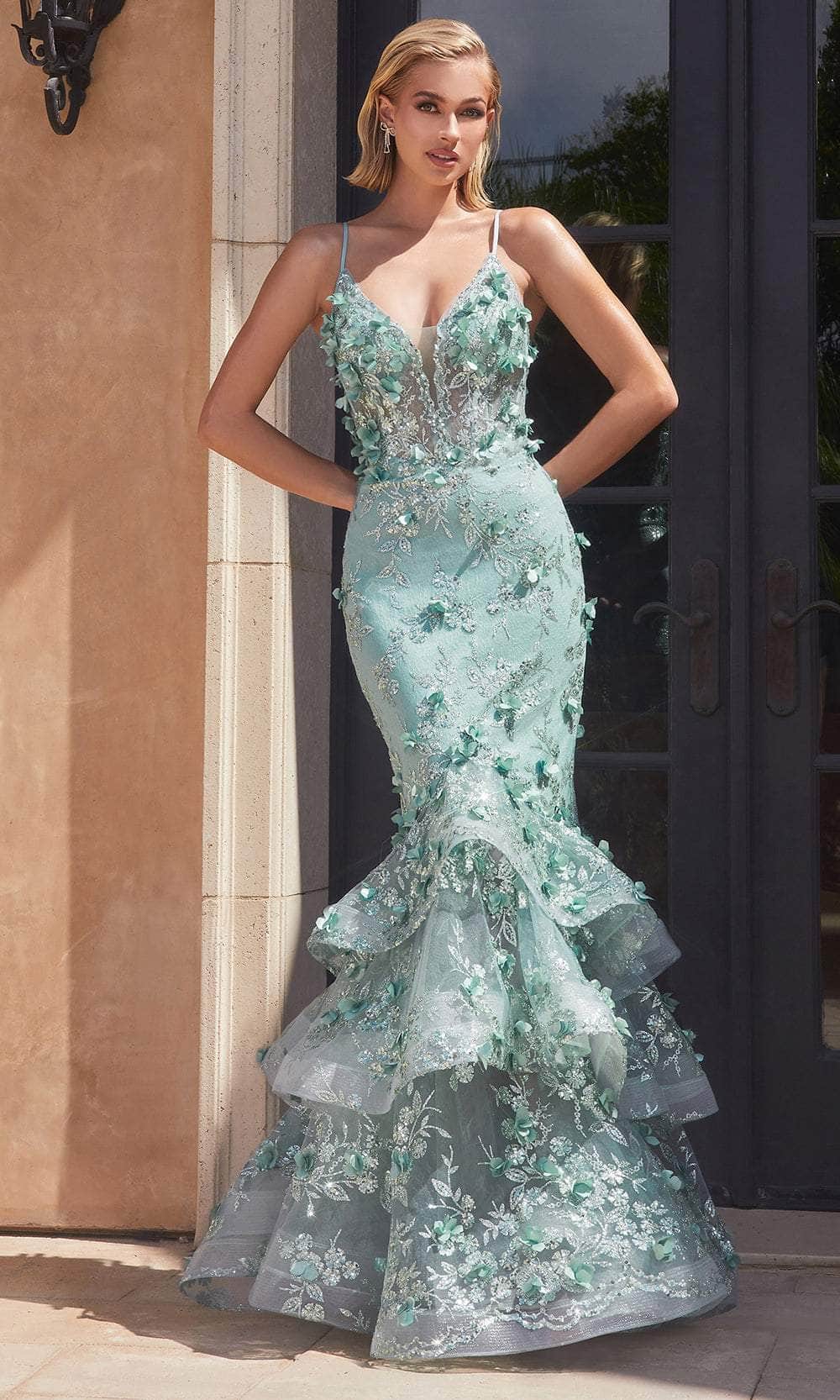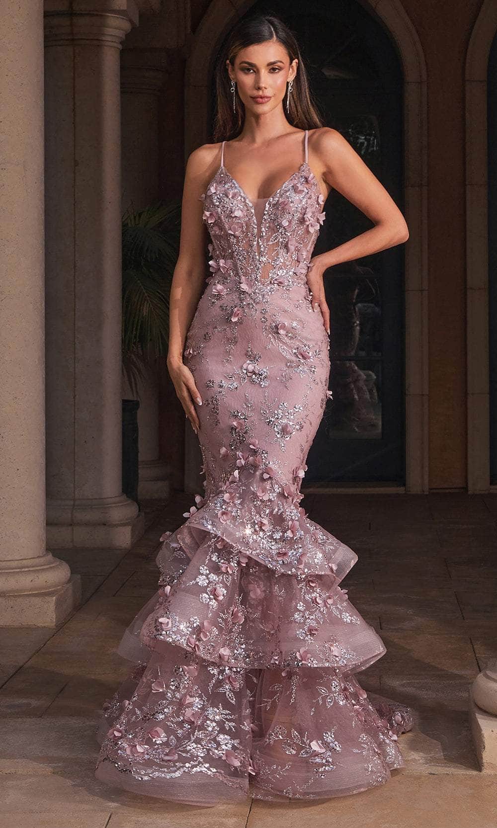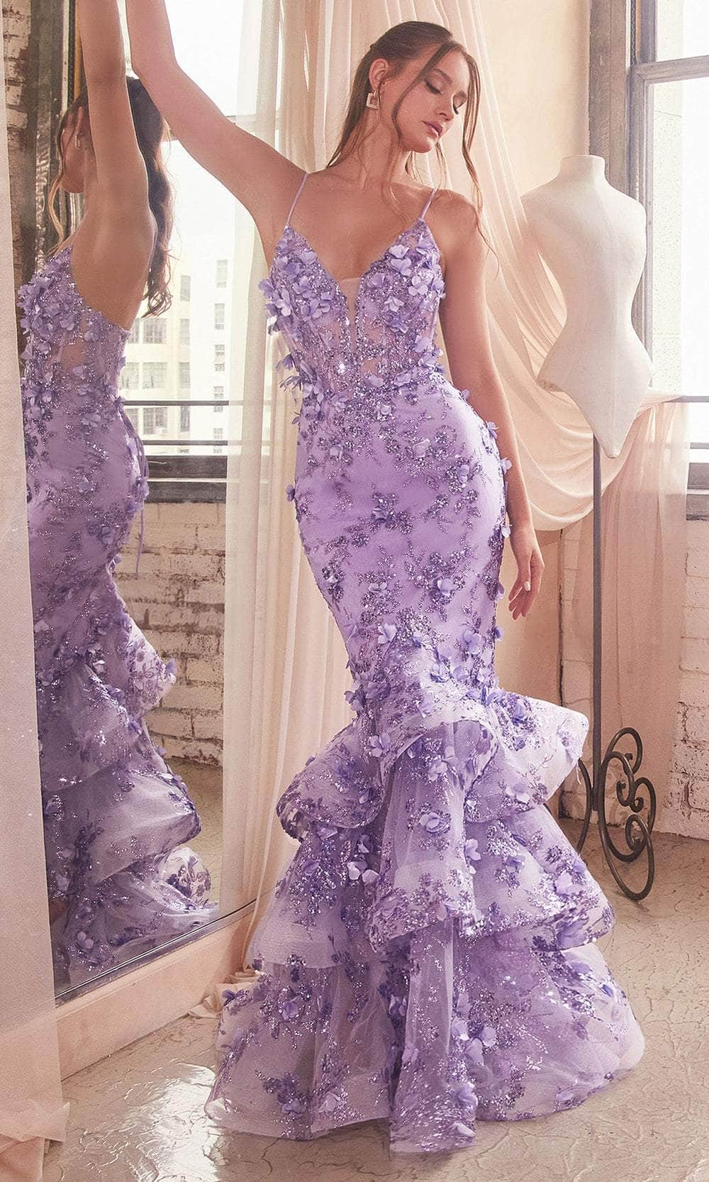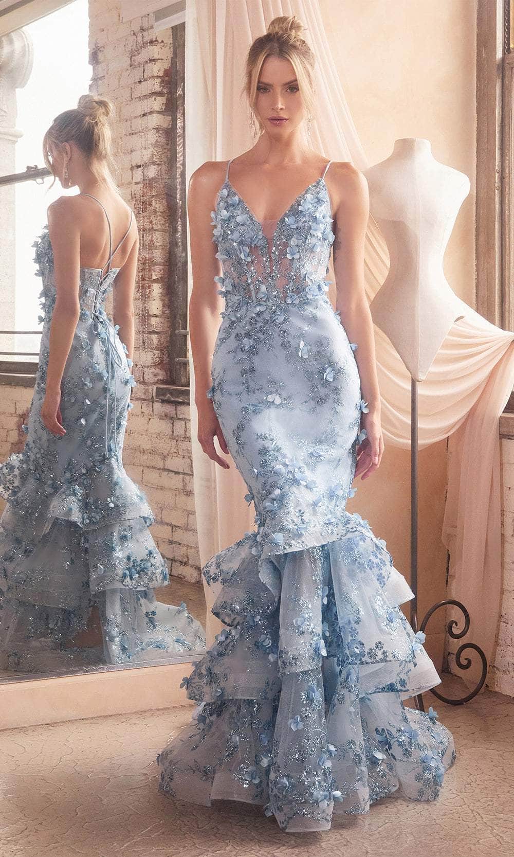 Shine with elegance in this Cinderella Divine CC2288 gown. Embellished with stunning 3D floral appliques and sparkling sequins, this sleeveless dress enhances your curves and turns heads. The bodice features an illusion corset with boning, a plunging V-neckline, and delicate spaghetti straps. The open back is complete with a lace-up design for a perfect fit. The tiered ruffles and horsehair hem of the skirt form a dramatic mermaid silhouette that flows into a sweeping train. Make an unforgettable entrance in this breathtaking Cinderella Divine CC2288 creation. Models are wearing Blue, Emerald, Fuchsia, Gold-Mist, Lavender, Mauve, Sage, Silver-Nude, and Red colors.