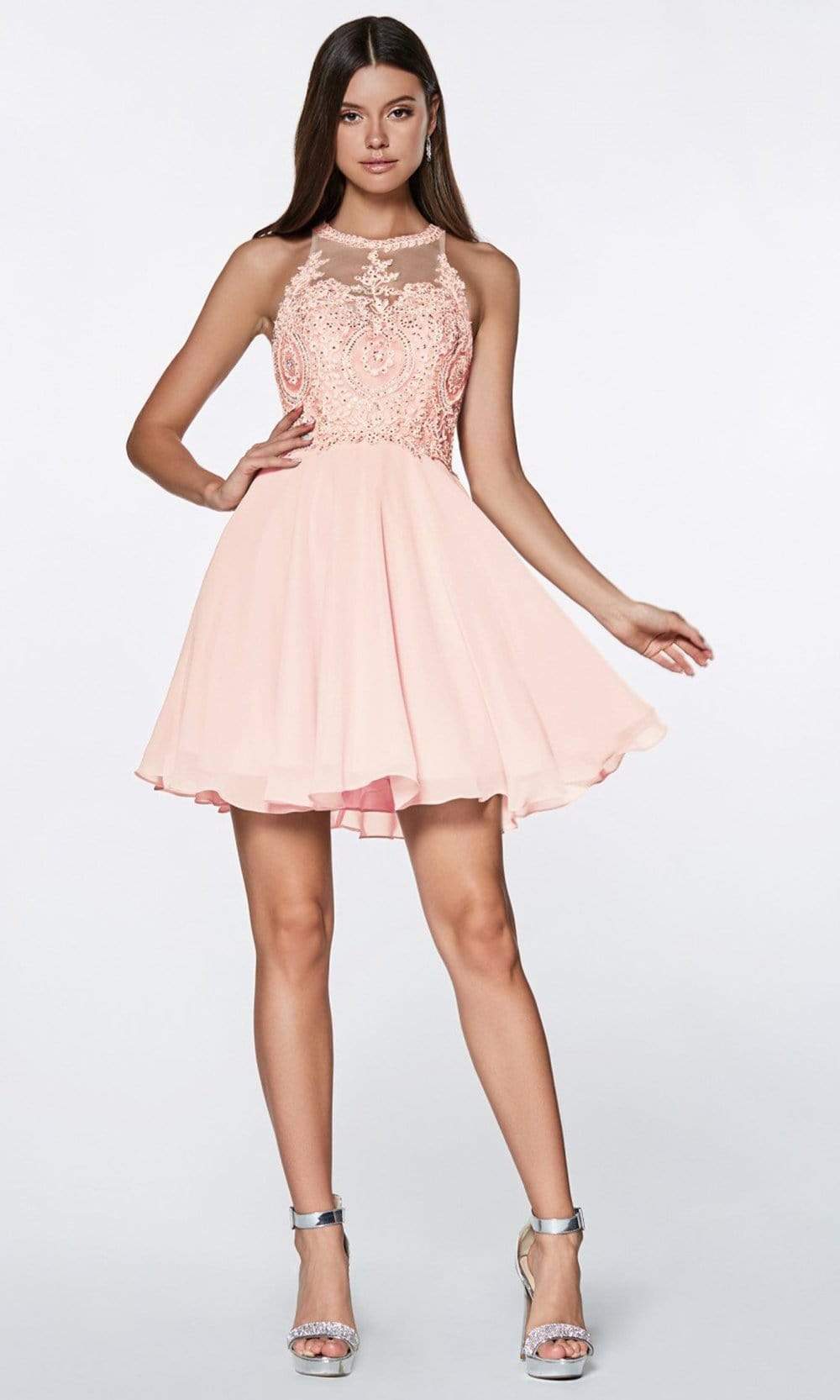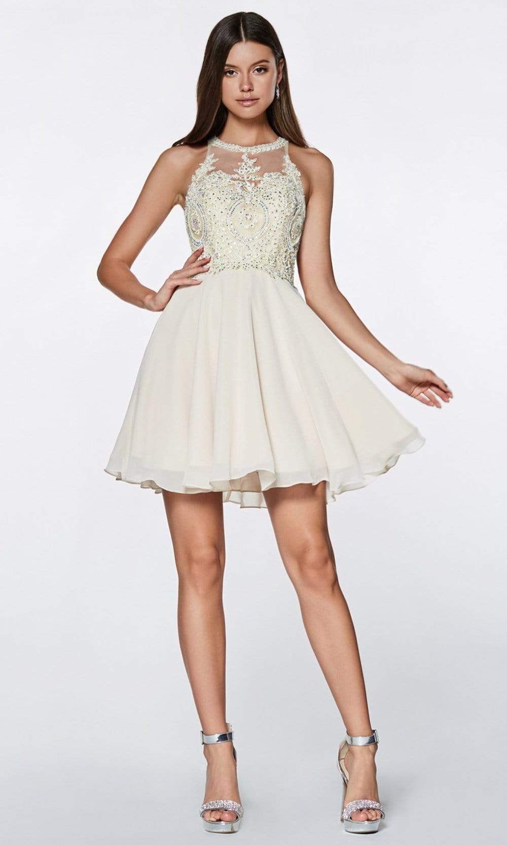 This charming short cocktail dress flaunts lace appliqued bodice with illusion halter. The back shows leafy lace strappy details with center zipper closure leading to flowy A-line chiffon skirt.