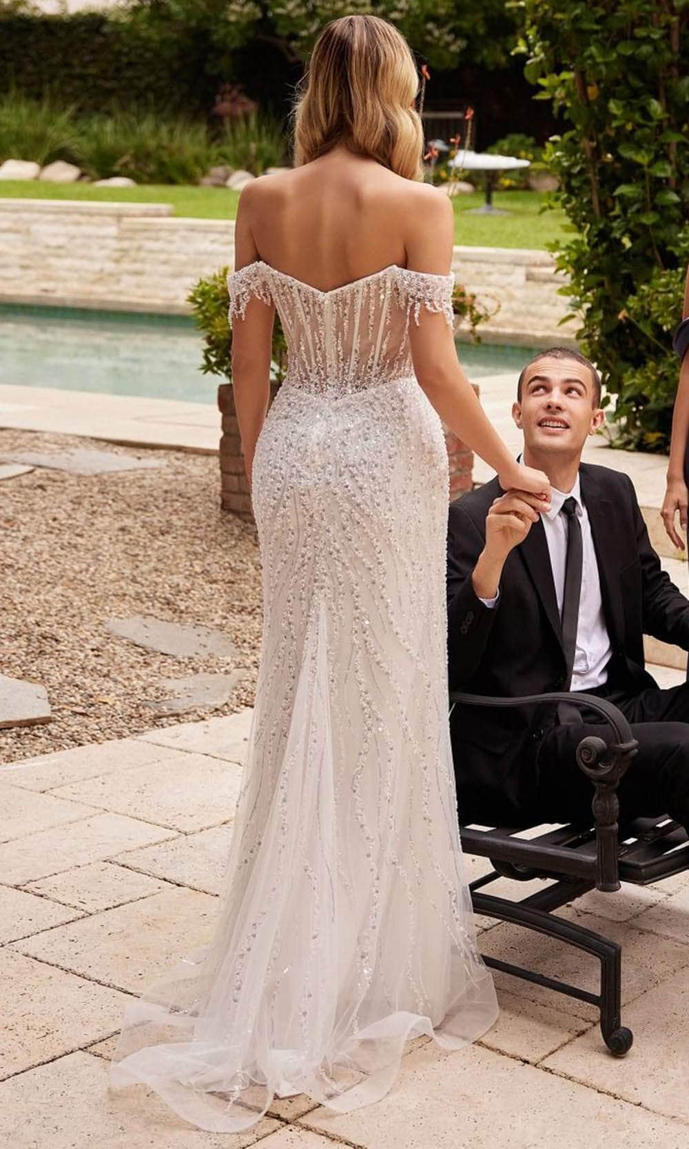 | Details: | Off-Shoulder, Corset Bodice, Sequin Fringe, Slit, Back Zipper Closure, Train |