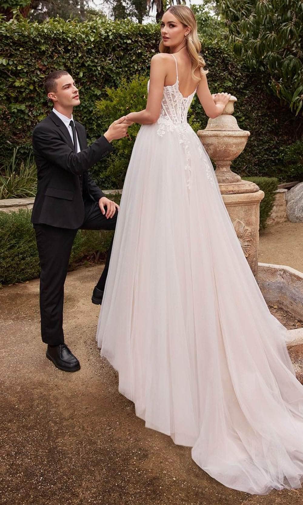 Enchant everyone in this Cinderella Divine CD854W bridal gown. This tulle A-line dress is designed to make an impression with its intricate lace applique bodice, elegantly framed by delicate straps and fastened with a charming lace-up corset back. The sheer bodice, supported by a structured boning and adorned with soft feminine details, offers an ethereal and captivating appeal. Flowing into a full-layered tulle skirt, the gown gracefully surrounds you, finishing with a stunning train for an added touch of grandeur. In Cinderella Divine CD854W, you will embody the essence of timeless romance and beauty on your wedding day. Model is wearing Off White color.
