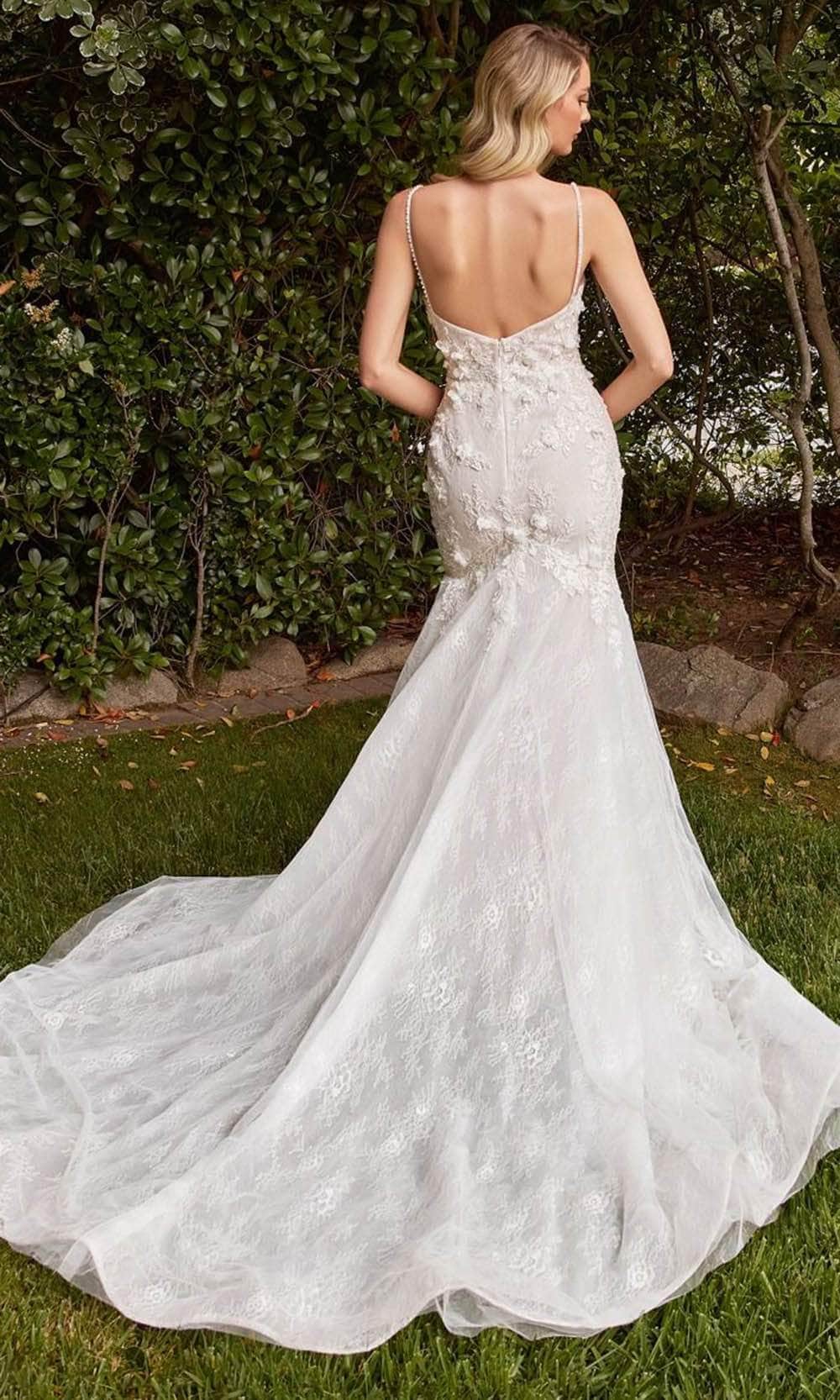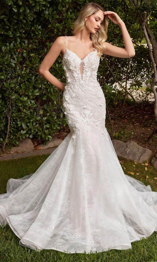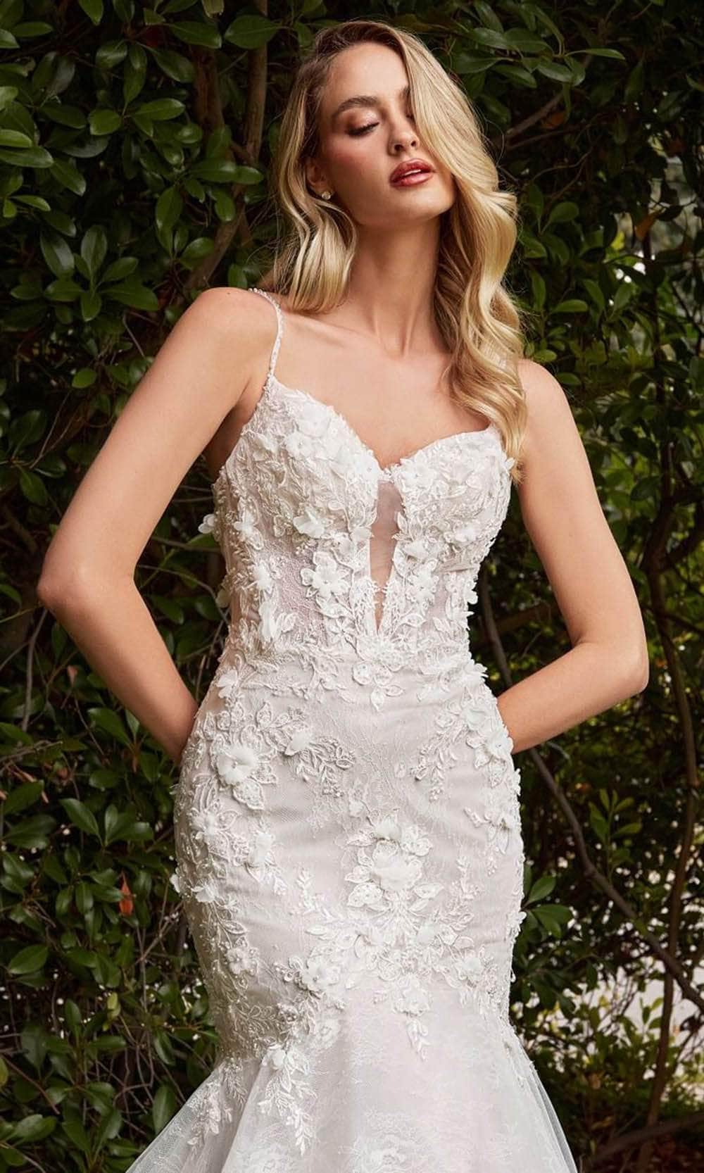 Embody the essence of bridal elegance and allure with Cinderella Divine CD856W. This lace mermaid wedding dress showcases a stunning silhouette, crafted from layers of delicate lace that flow gracefully along your curves. A deep plunging keyhole neckline introduces a touch of sultry sophistication, while dimensional floral appliques trail down to the waist. Delicate thin straps lead to a subtly mid-open back, and a secure zipper closure completes the look. Finished with a sweeping train, Cinderella Divine CD856W is the ideal choice for brides who seek a blend of timeless beauty and modern appeal. Model is wearing Off White color.