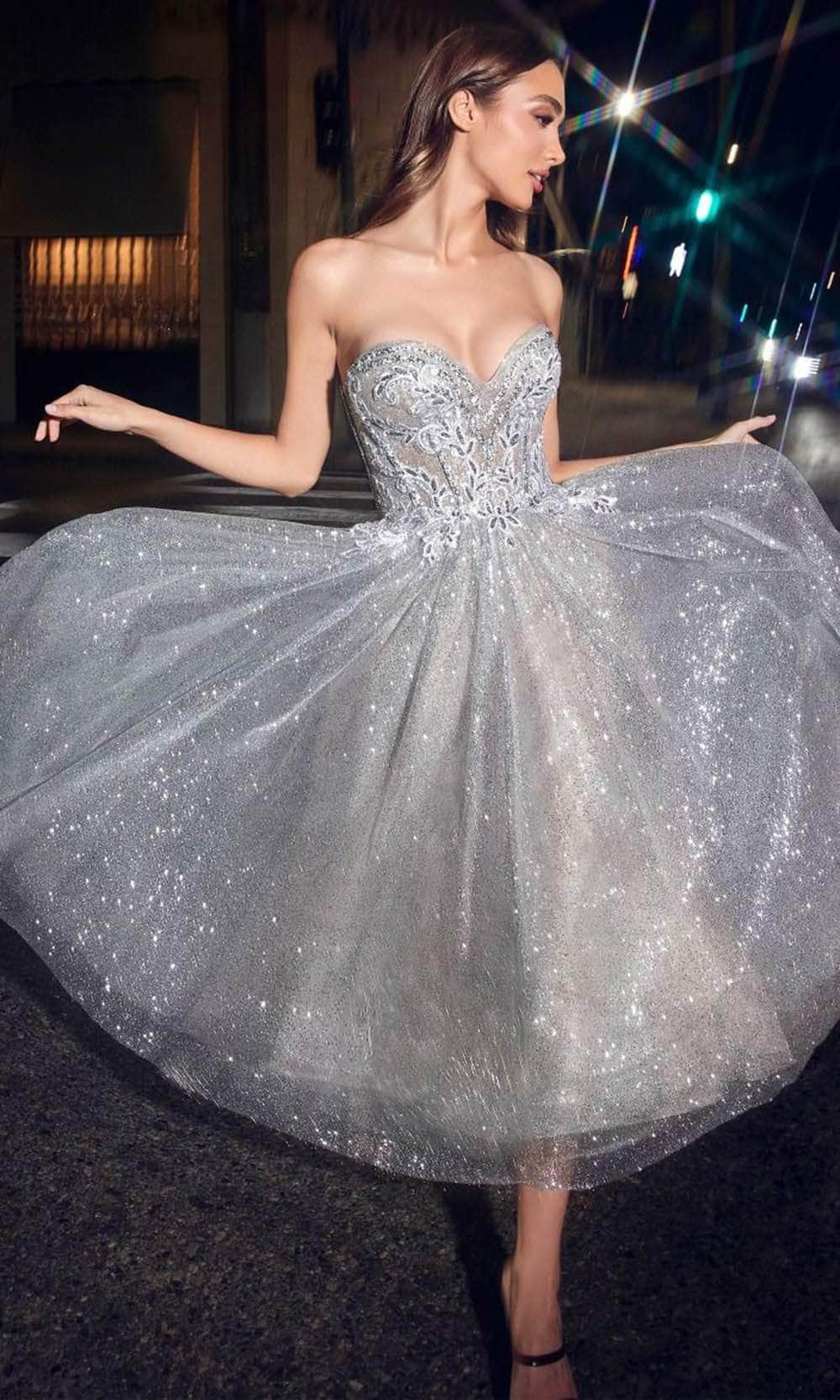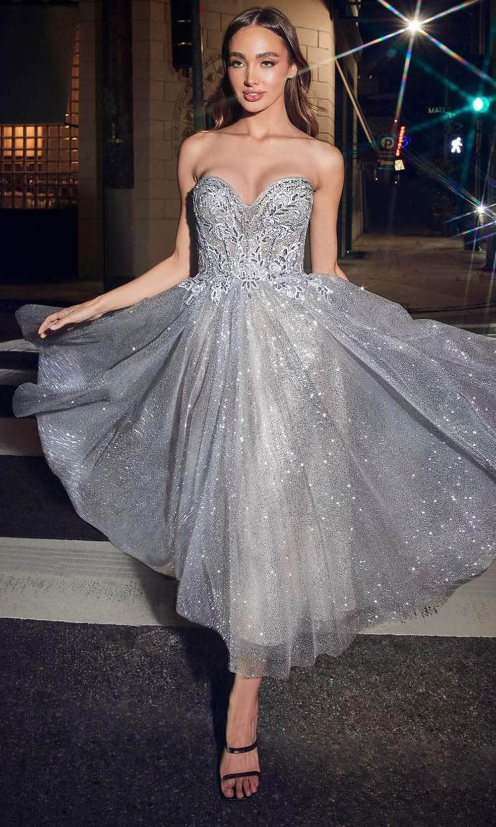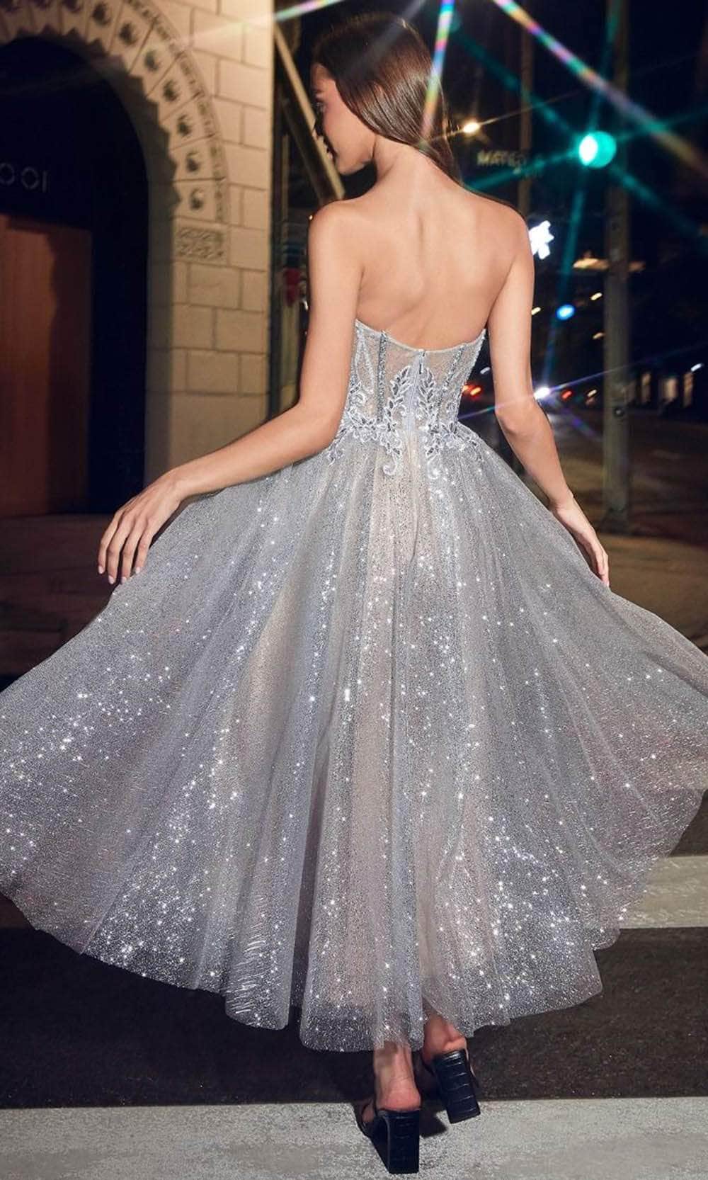 Shine in the spotlight with Cinderella Divine CD871, a strapless A-line dress that ensures you feel like the true showstopper you are. Crafted to capture attention, this gown features a fully glittered fabric that sparkles with every movement, a layered tulle skirt adding volume and grace, and a lace-embellished bodice for a touch of sophistication. Expertly tailored to highlight your waist and enhance your figure, this dress guarantees a stunning appearance. Light up any event with your charm and elegance in the stunning Cinderella Divine CD871. Model is wearing Silver color.