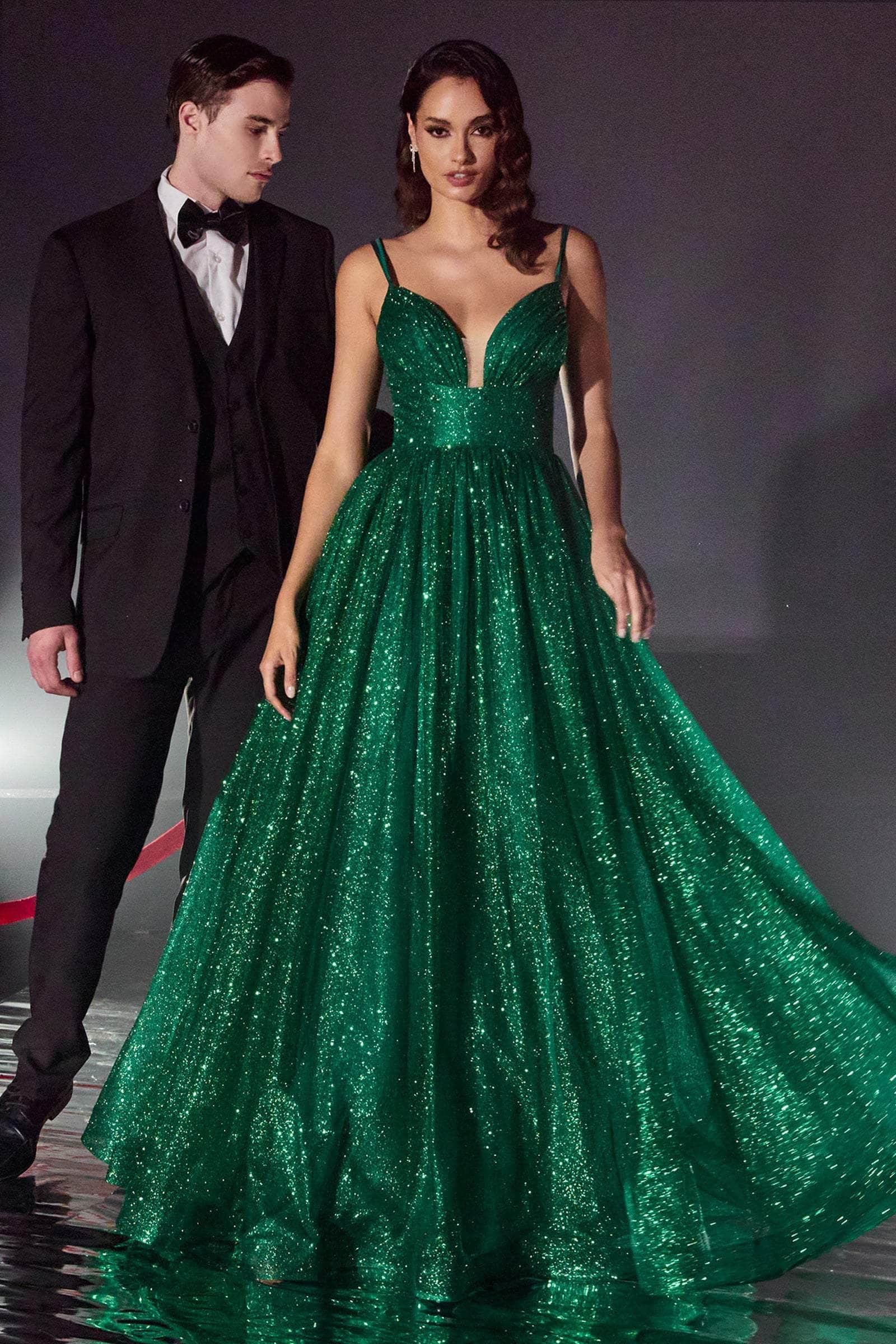 Prepare to feel magical in this Cinderella Divine CD996 masterpiece. This eye-catching gown is elegantly crafted from glittered fabric, showcasing a ruched details on the deep sweetheart neckline and a sheer inset detail at the bust. The wide waistband and dual spaghetti straps are also highlightedA glimpse of skin is revealed in the mid-open back, beautifully secured by a corset lace-up tie closure for a customizable fit. The layered skirt flares a ballgown silhouette flowing into a full-length hem, completed with sweeping train for a dramatic allure. Be the spotlight wearing this Cinderella Divine CD996 creation. Models are wearing Black, Emerald, Red, Silver, Fuchsia, and Royal colors.