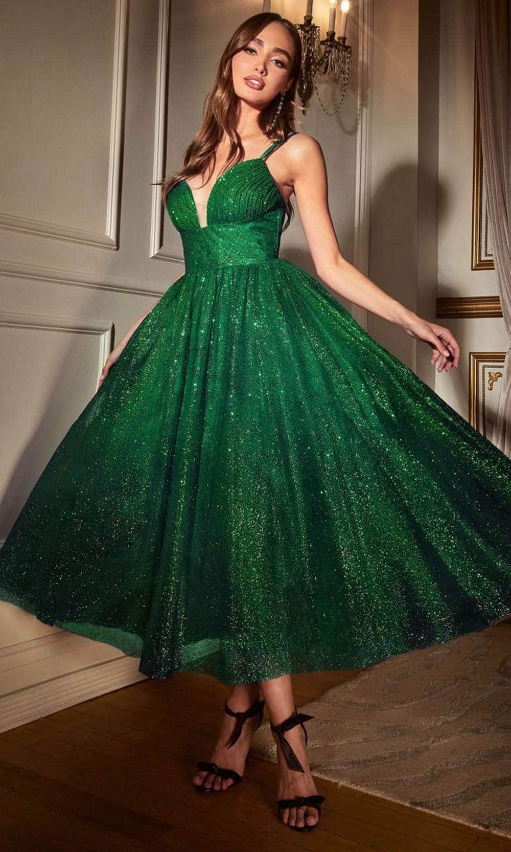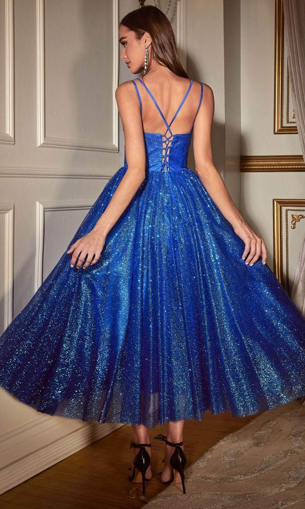 Elevate your style with the sparkling elegance of Cinderella Divine CD996T, a tea-length dress that seamlessly blends glamour and sophistication. This gown features a captivating A-line silhouette with a glittering bodice that catches the light with every step. The empire waistline flatters your figure, while the layered tulle skirt adds a whimsical touch. A gathered bust and lace-up corset back provide a sultry edge, making it the perfect choice for any statement-making event. Shine confidently in this stunning Cinderella Divine CD996T creation. Models are wearing Black, Emerald, Red and Royal colors.