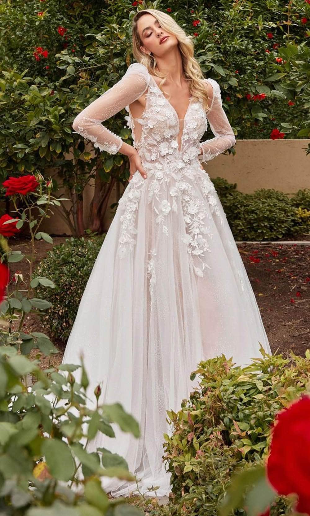 Embrace romance in the enchanting Cinderella Divine CDS436W. This beautiful gown features a sleeveless bodice adorned with delicate lace appliques and 3D floral details, creating a truly ethereal look. The plunging neckline introduces a touch of sultry elegance to your bridal ensemble, while the sheer bodice adds a hint of allure. The layered tulle skirt is embellished for added depth and texture, and the open back allows you to showcase your radiant bridal glow. Finished with a graceful train, Cinderella Divine CDS436W ensures an unforgettable impression on your special day. Model is wearing Off White color.