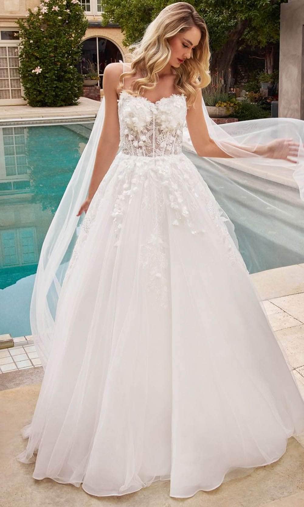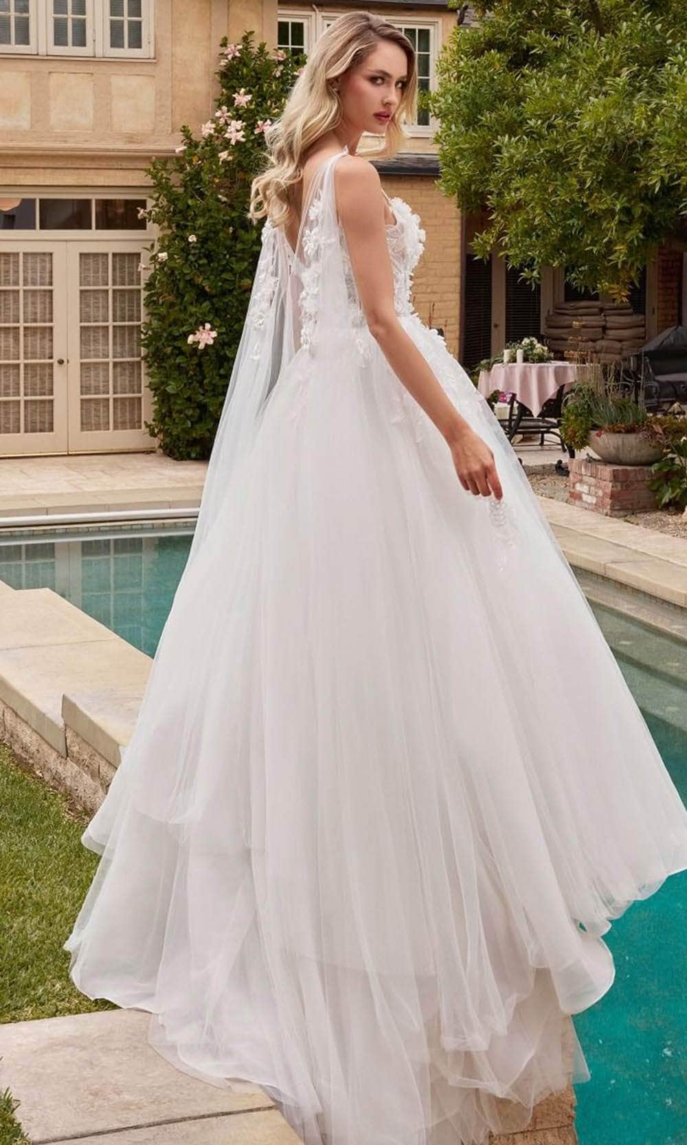 Cinderella Divine CDS437W is designed to exude elegance and romance on your special day. With beautifully layered tulle and dimensional floral appliques, this gown creates a dreamy and ethereal aesthetic. The sheer bodice, featuring a sweetheart neckline, offers a delicate hint of skin, while thin straps and a long tulle overlay ensure a graceful look from every angle. The sweeping train adds a touch of grandeur, leaving a lasting impression on all who see you. Cinderella Divine CDS437W is the perfect gown for brides seeking timeless beauty and sophistication. Model is wearing Off White color.