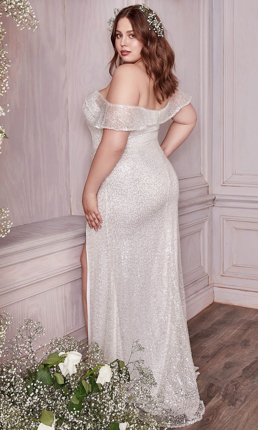 Show off your glamorous side wearing this stunning Cinderella Divine CH167W. This sparkly ensemble charms in a plunging sweetheart neckline with inner mesh and a very feminine off-shoulder sleeves. The dress is crafted with visible seam sculpted silhouette to enhance a flattering figure. The skirt flaunts a thigh high leg slit and flourishes in sweep train finish. Look dainty and elegant with this Cinderella Divine masterpiece. The versatility of Cinderella Divine Bridal collection is simply unmatched. It is a treasure trove for every bride who wants to come across a number of unique picks for her wedding. Model is wearing White color.