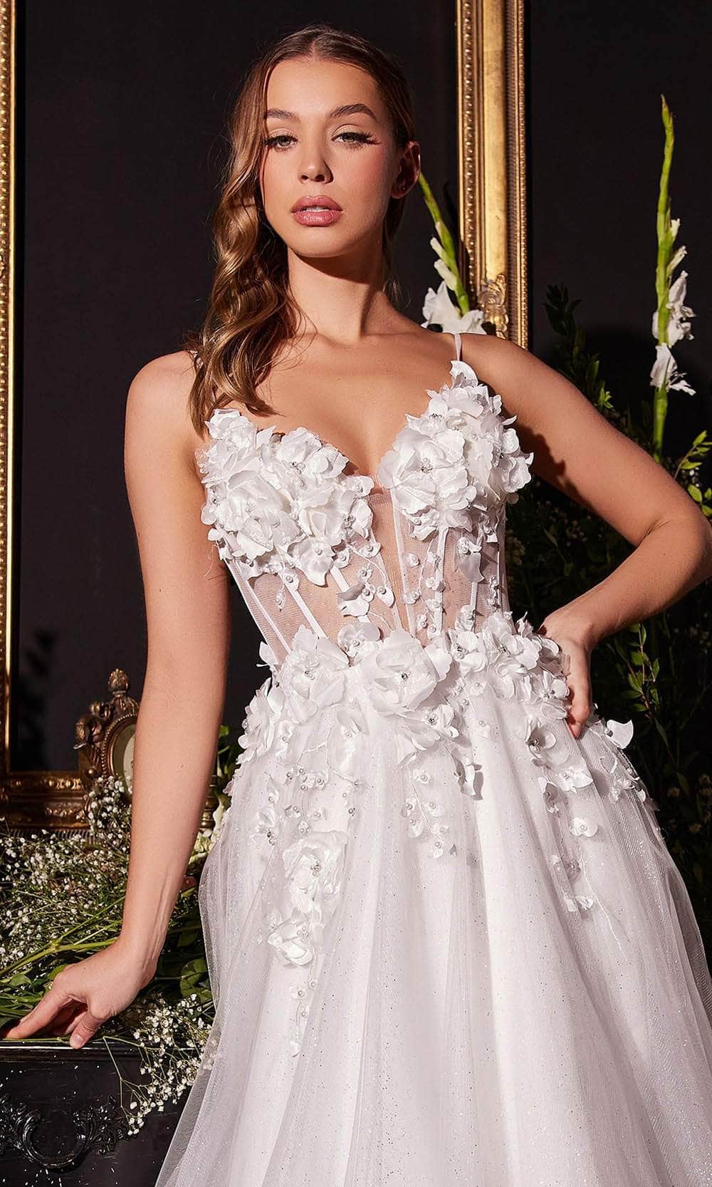 Get ready to shine on your big day in this captivating Cinderella Divine CM321W bridal gown. The flattering A-line silhouette suits all body types, while the sleeveless sheer boned bodice adds an enticing touch. Decorated with intricate dimensional floral appliques, this gown embodies timeless elegance. Delicate thin straps frame your shoulders, leading to a romantic mid-open back. The lace-up tie closure guarantees a flawless fit, ensuring that Cinderella Divine CM321W makes you the picture of bridal beauty and grace. Model is wearing Off White color.