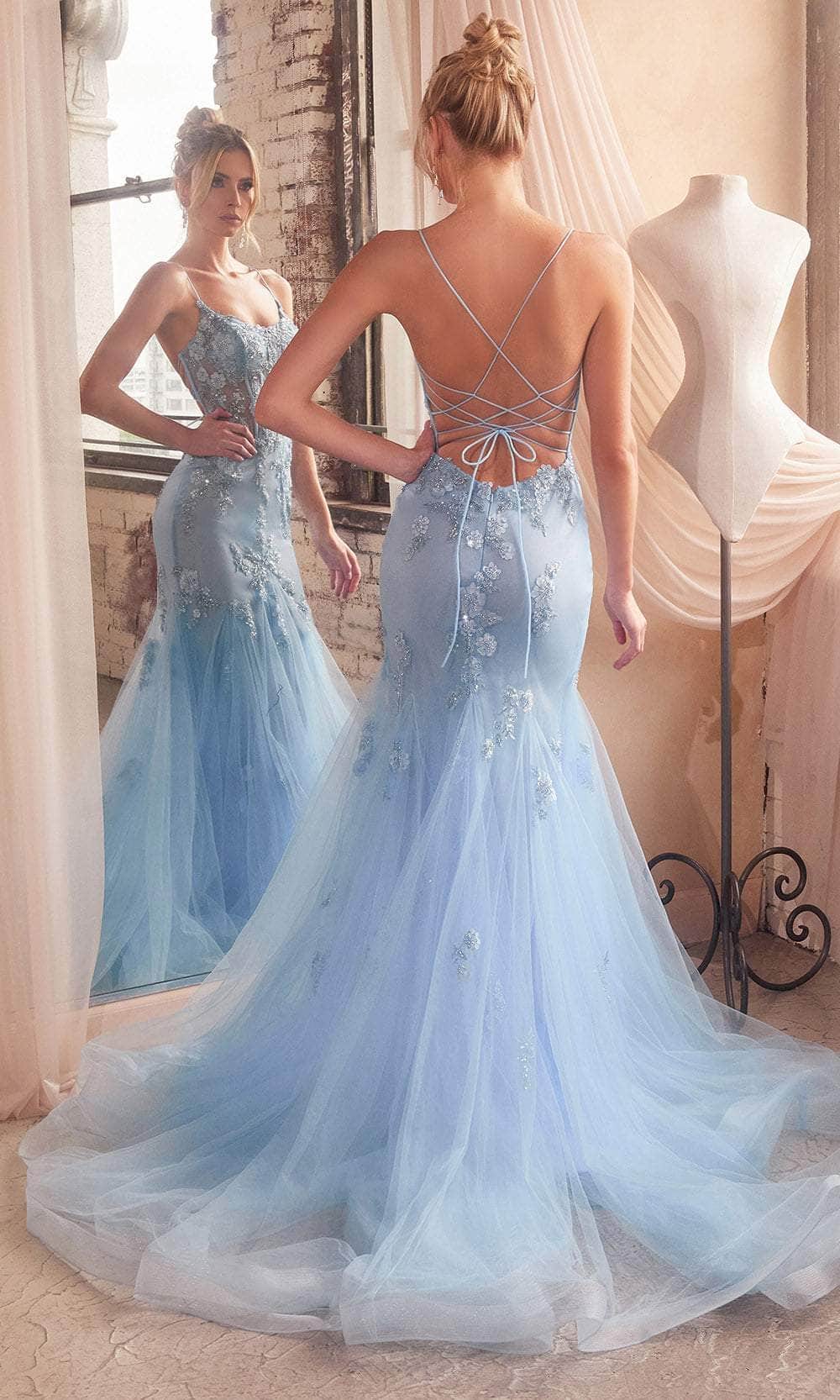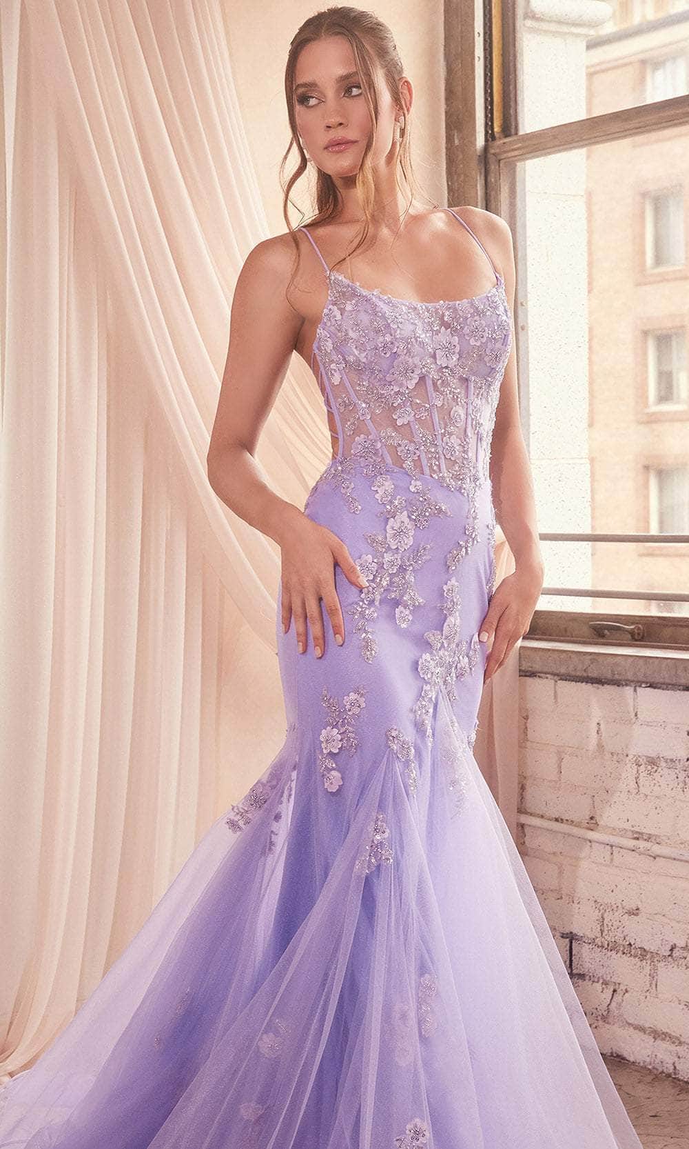 Leave them in awe with this Cinderella Divine D145 creation. This elegant gown is embellished with captivating 3D floral appliques and beadwork, accentuating the illusion corset bodice that highlights your figure. A scoop neckline and slender spaghetti straps gracefully frame the shoulders, while the open back features a strappy lace-up closure for a perfect fit. The skirt, enhanced with tulle godets and a horsehair hem for added volume, flares into a trumpet silhouette that cascades into a sweeping train. Make your unforgettable entrance in this Cinderella Divine D145 masterpiece. Models are wearing Lavender, Light Blue, Pink, Sage, and Yellow colors.