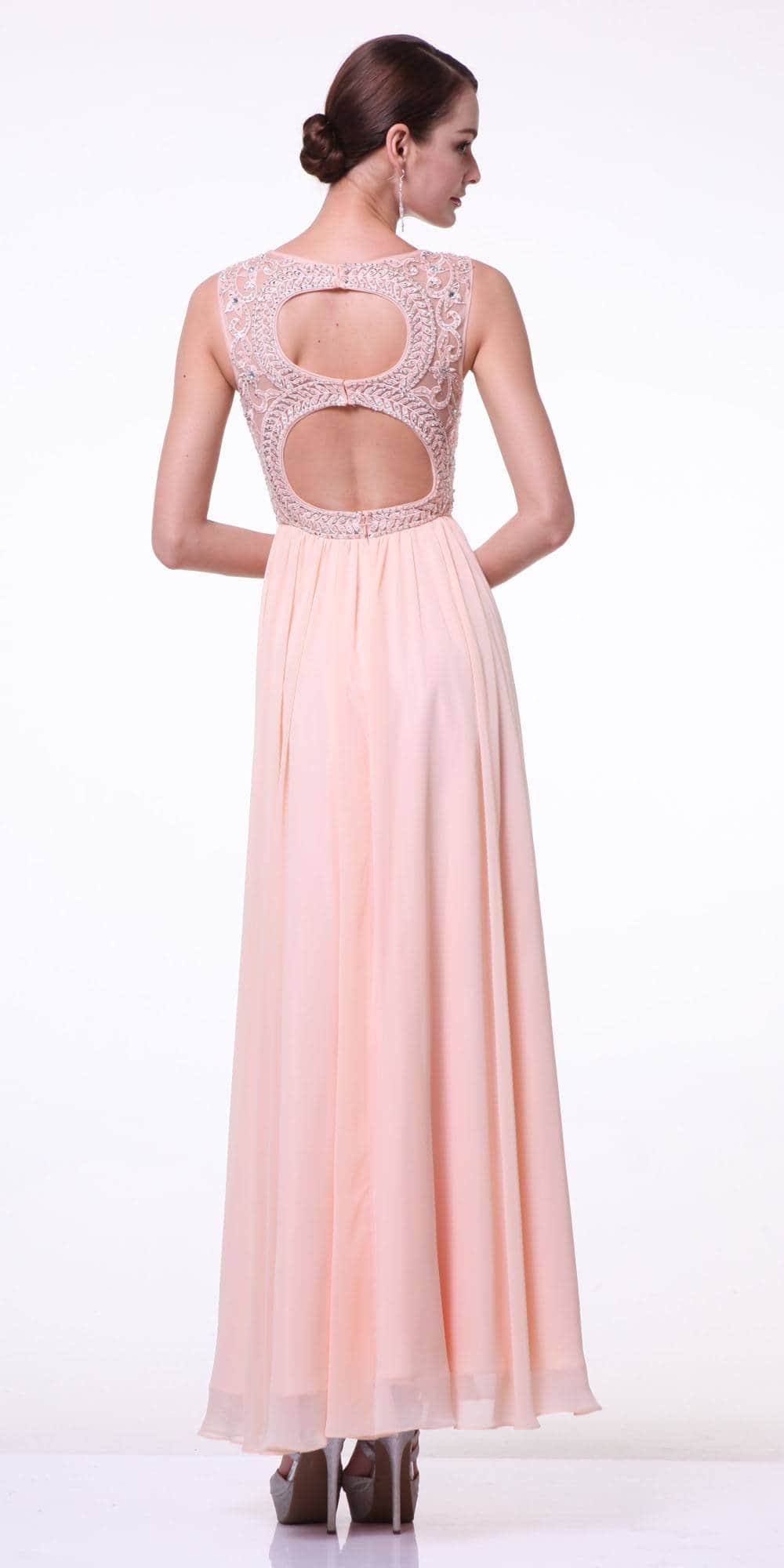Enter the hall with grace and beauty in this charming evening gown from Cinderella Divine J710. Parading a spectacle of lace appliques sprinkled with jewels, the embellished bodice boasts of a jewel illusion neckline and a sleeveless silhouette with back cutouts. Below the beaded waistline, a lustrous A-line skirt is layered and shirred for a fluted look that falls down to the ground. This creation from Cinderella Divine is simply breathtaking! Dress is pictured in Champagne and Blush colors.