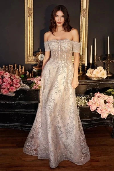 Indulge in a beautifully romantic aesthetic with the enchanting Cinderella Divine J835 gown. This exquisite creation features intricate glitter prints arranged in a mesmerizing swirling motif, enhancing its visual charm. The gown is designed with an off-shoulder neckline adorned with delicate lace trims and boasts short sleeves alongside a corset-boned bodice that perfectly flatters your figure. The satin-like skirt is elegantly overlaid with a glittering fabric, creating a graceful A-line silhouette that flows into a sweeping train. Embrace a style that embodies elegance and beauty in this remarkable Cinderella Divine J835 masterpiece, making you the center of attention at any event. Models are wearing the Emerald, and Rose Gold colors.