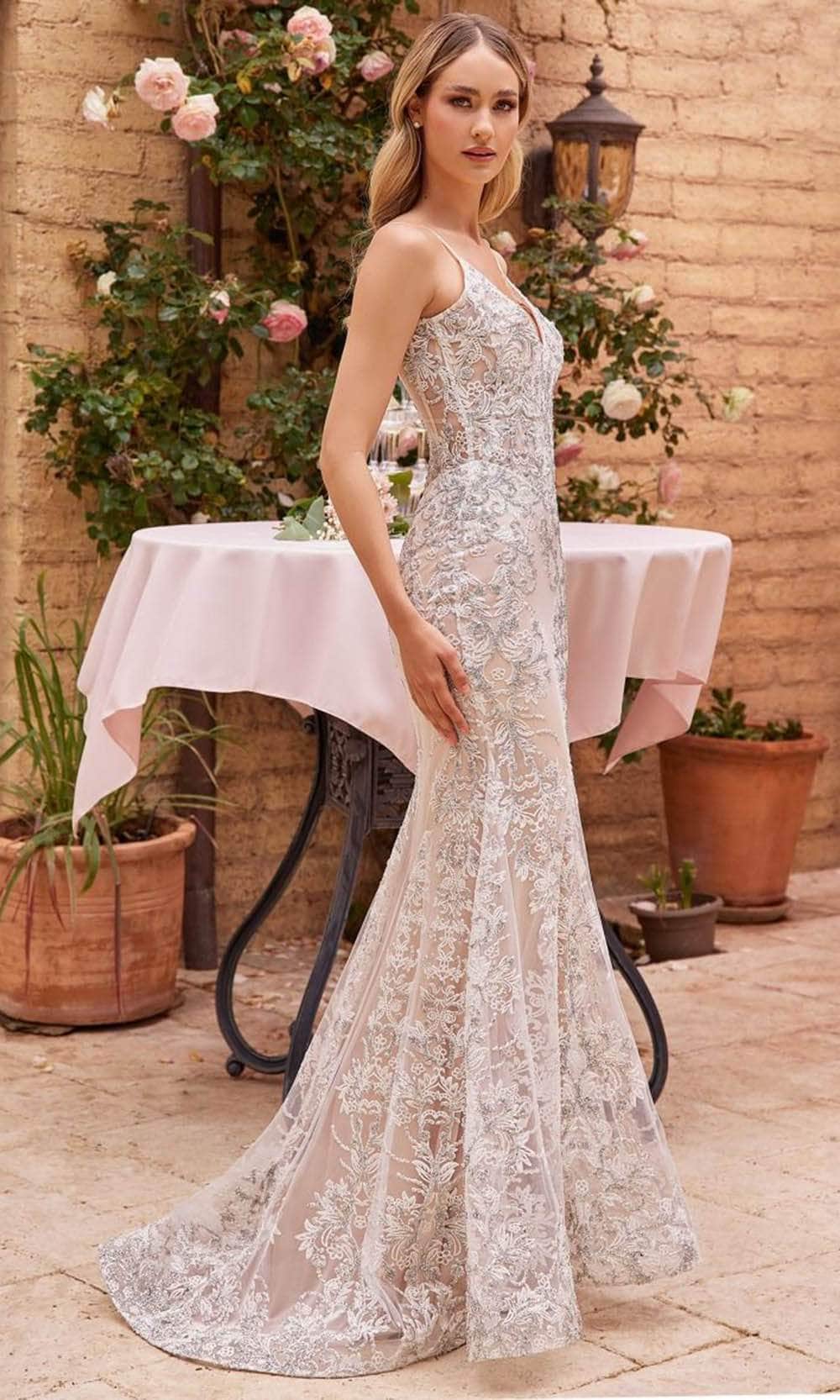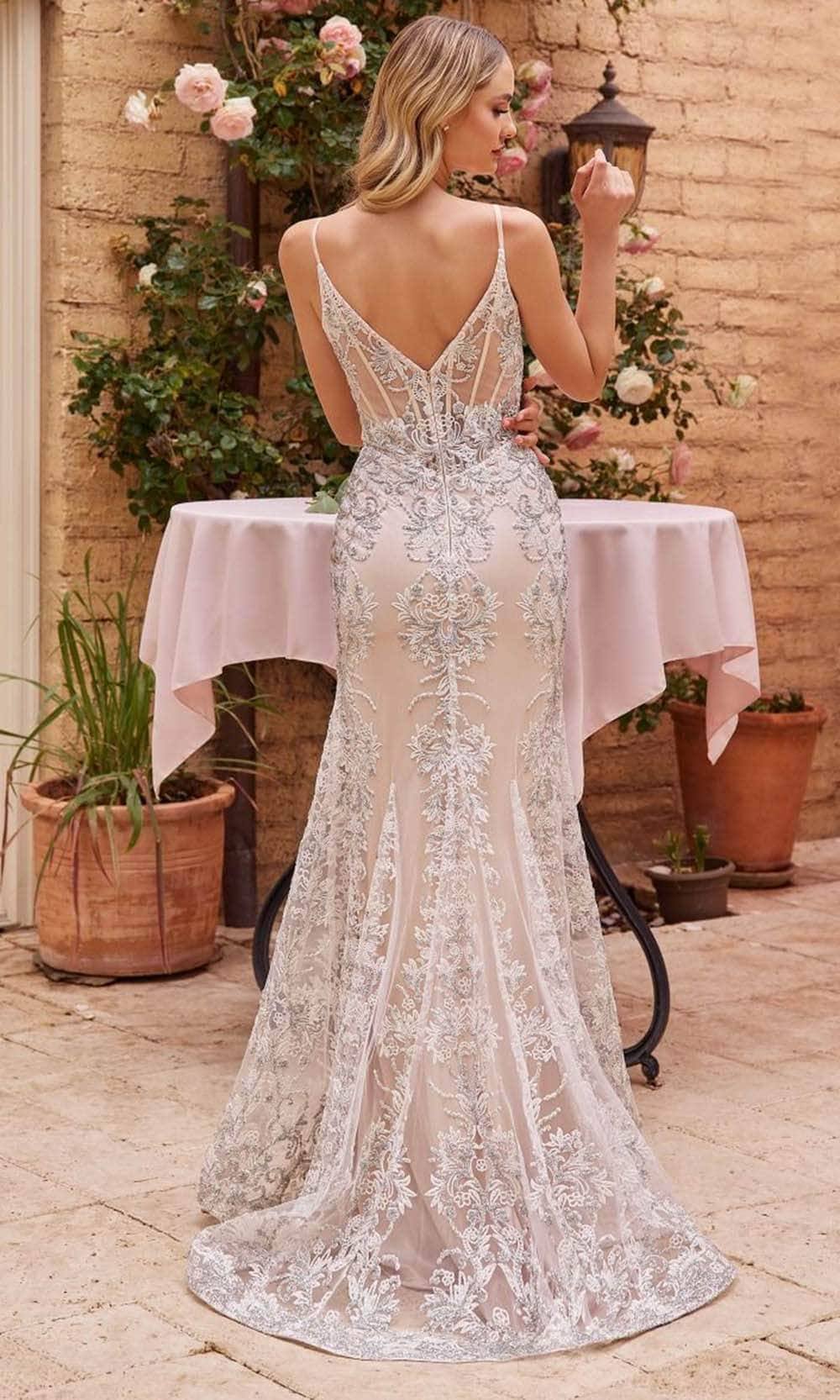 Step into your special day looking like royalty in Cinderella Divine J859W. This exquisite gown is adorned with sparkling embroidery that catches the light beautifully, creating a mesmerizing, radiant effect. Thin straps elegantly frame the sleeveless sheer boned bodice, while the V-shaped back adds a touch of sophistication. With a convenient back zipper for easy wear, the gown flows into a sweeping train, ensuring you make a grand entrance and leave a lasting impression. Cinderella Divine J859W is the epitome of glamour and allure for any unforgettable occasion. Model is wearing Off White/Nude color.