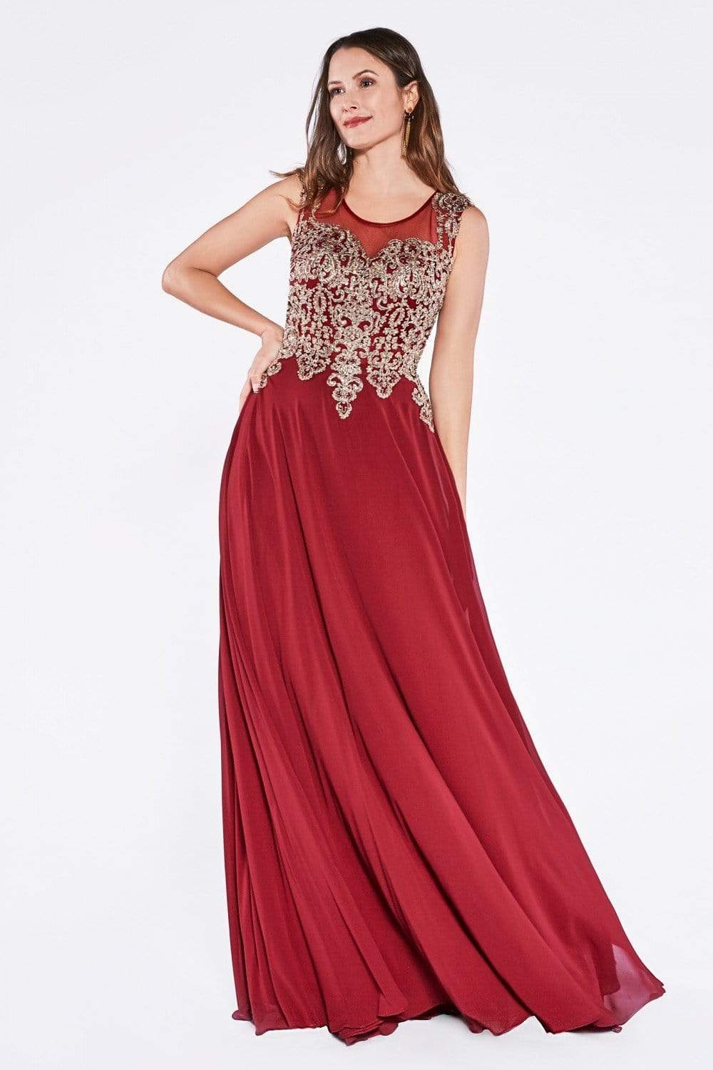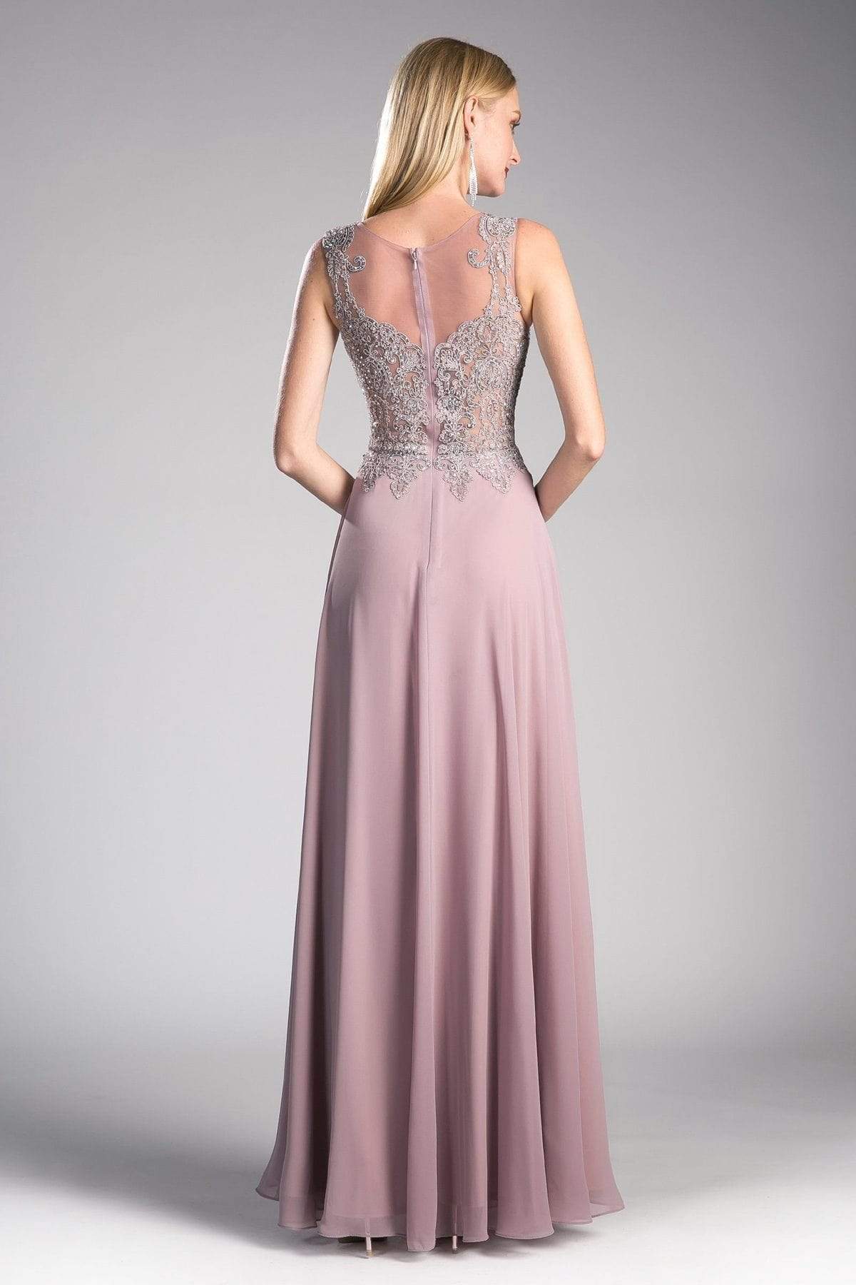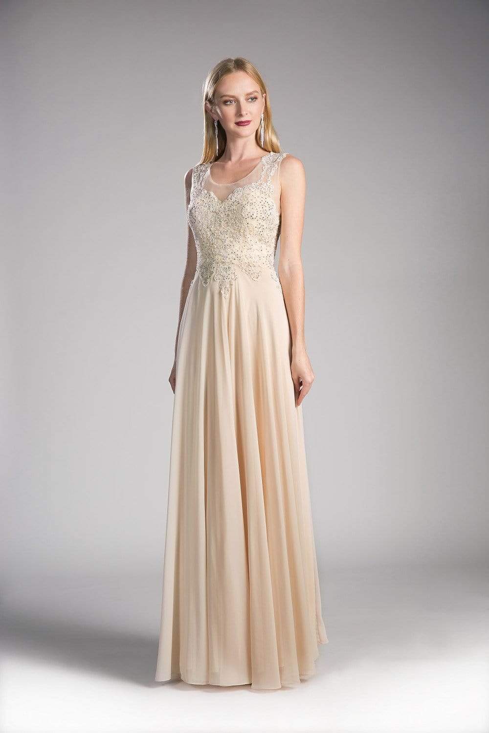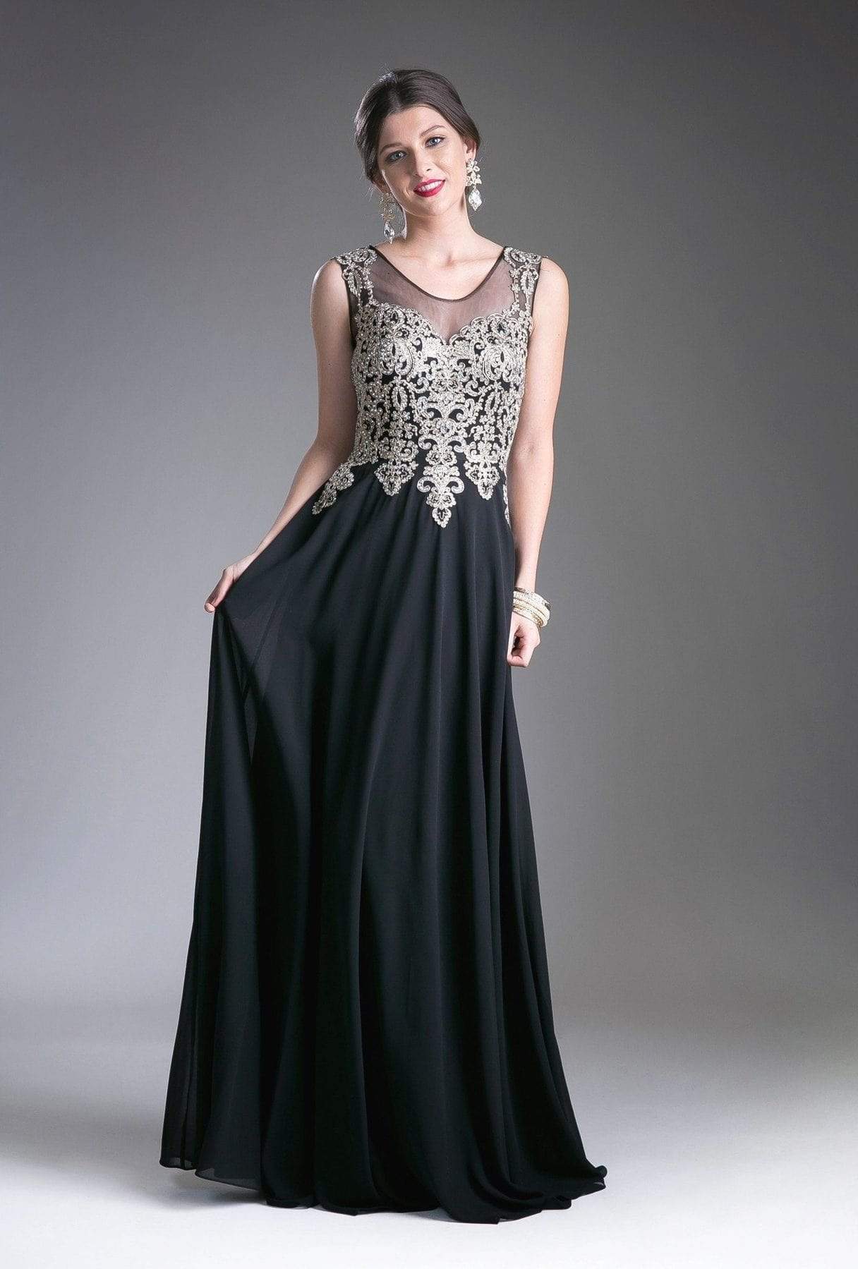 Look angelic and pristine as you grace your black-tie event in this classy Cinderella Divine 2635 creation. Flaunting a jewel-detailed metallic lace applique on a sheer bodice, this darling shows off an illusion scoop over a tonal sweetheart neckline. Festooned twinkling gilded adornments trailing down the illusion back and just below the waist, the cascading chiffon skirt flutters to create a full-length A-line silhouette. Look divine and enticing as you stun the crowd in this Cinderella Divine masterpiece.
