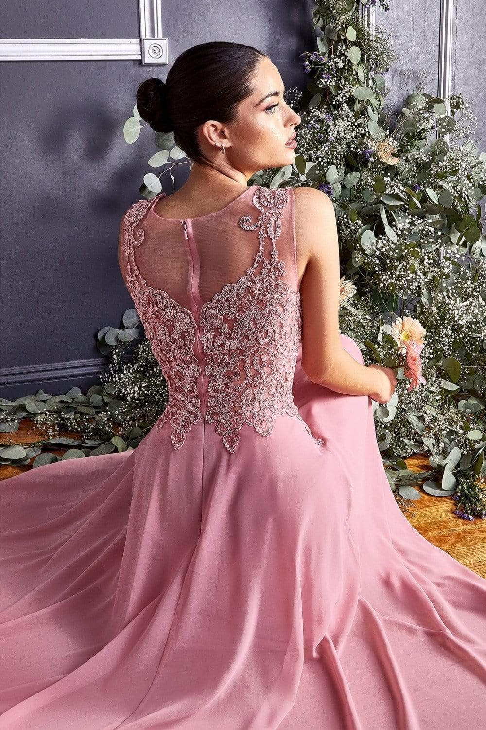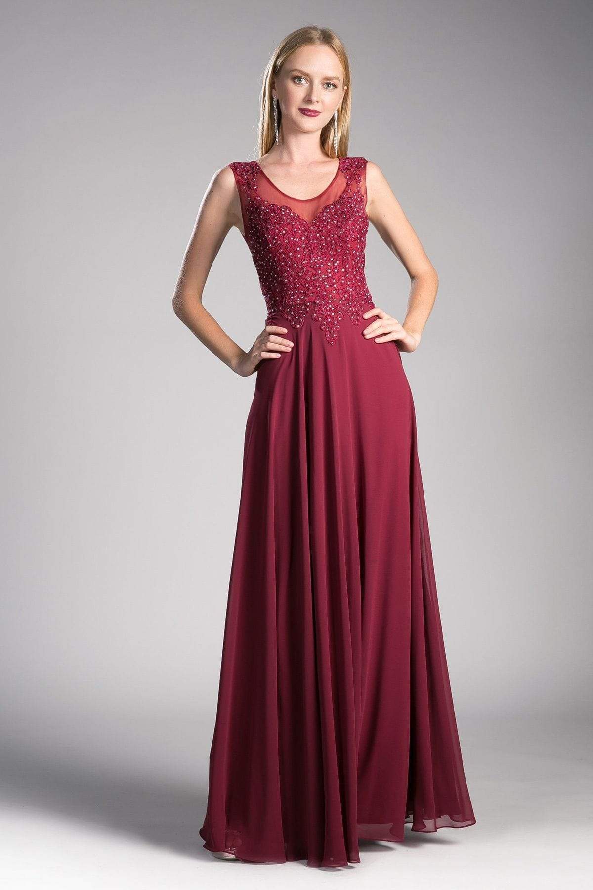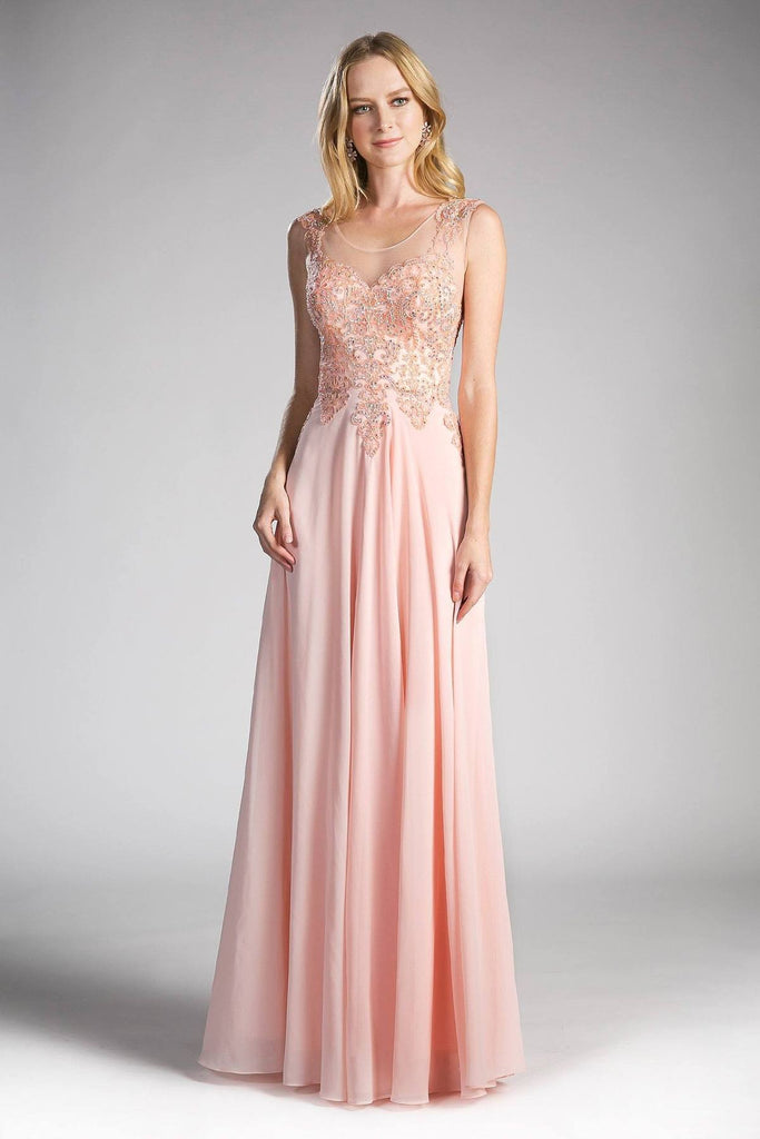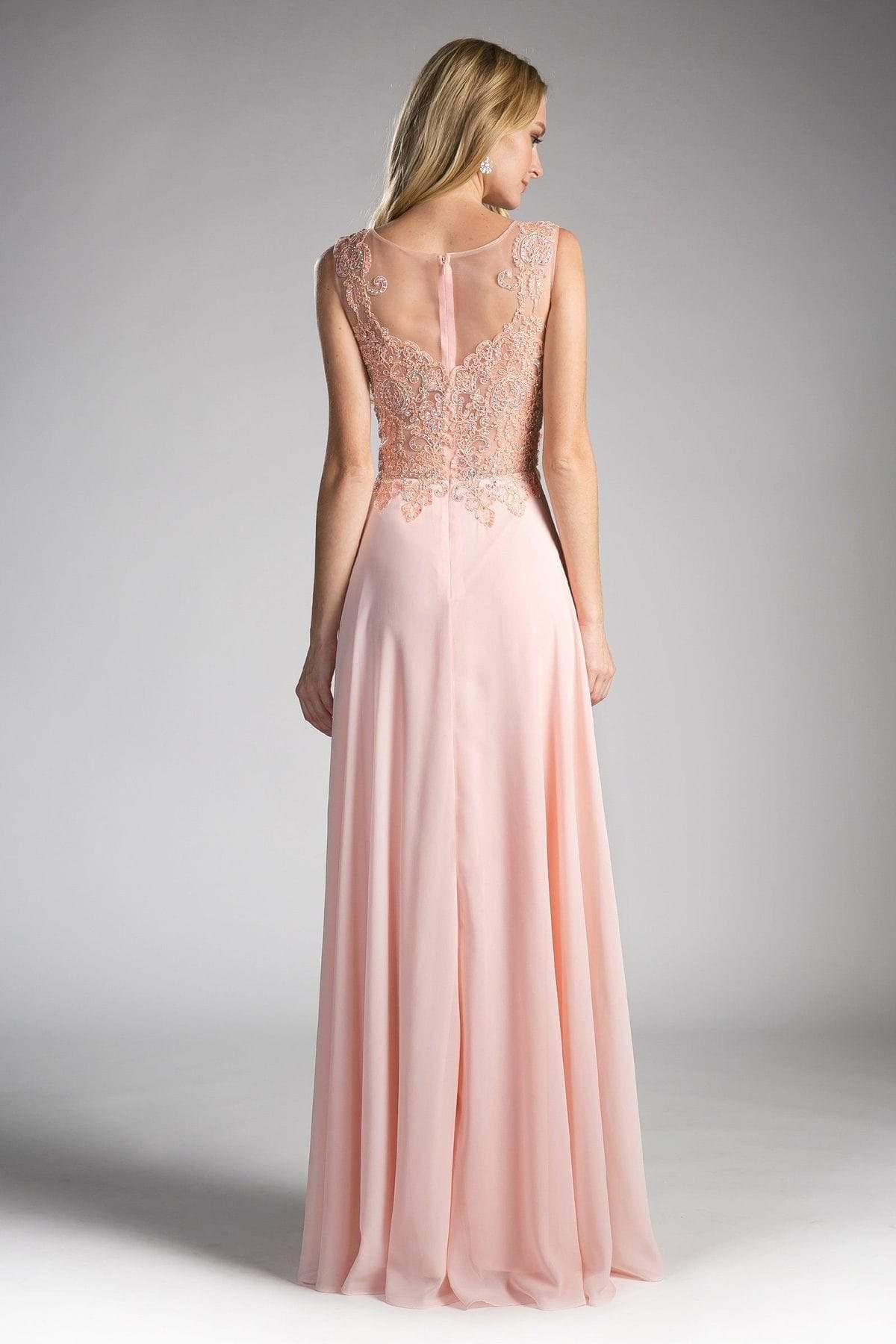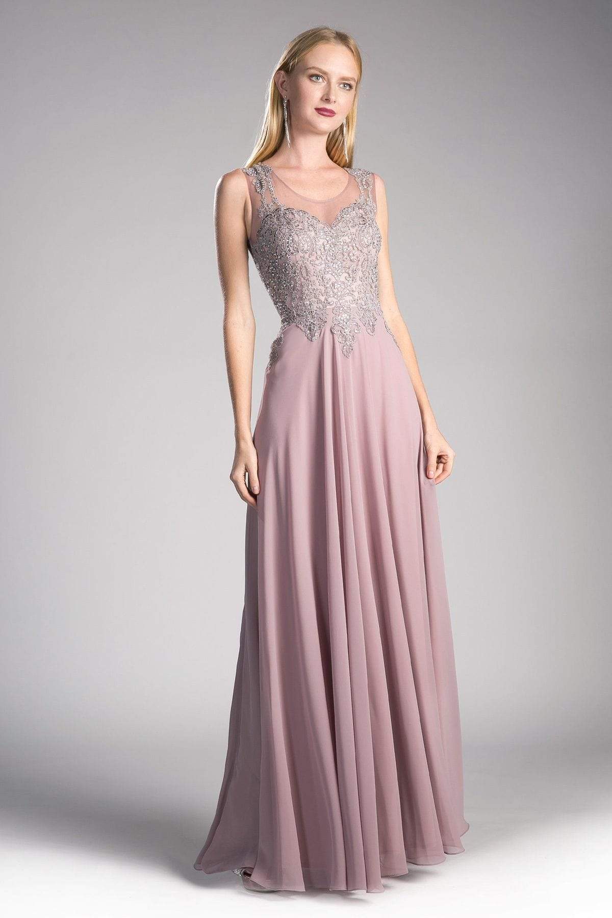 Look angelic and pristine as you grace your black-tie event in this classy Cinderella Divine 2635 creation. Flaunting a jewel-detailed metallic lace applique on a sheer bodice, this darling shows off an illusion scoop over a tonal sweetheart neckline. Festooned twinkling gilded adornments trailing down the illusion back and just below the waist, the cascading chiffon skirt flutters to create a full-length A-line silhouette. Look divine and enticing as you stun the crowd in this Cinderella Divine masterpiece.