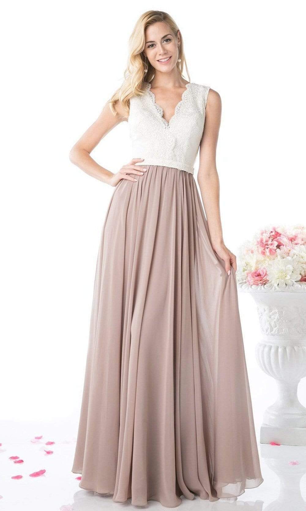 Inspire a vision of loveliness in this long dress by Cinderella Divine 1965. Features a sleeveless, scalloped V-neckline with a curved low V-back with zipper closure. This two tone dress is designed with lace fitted bodice and forms a full length A-line skirt. Leave a trail of admirers as you glisten in beauty in this Cinderella Divine masterpiece.
