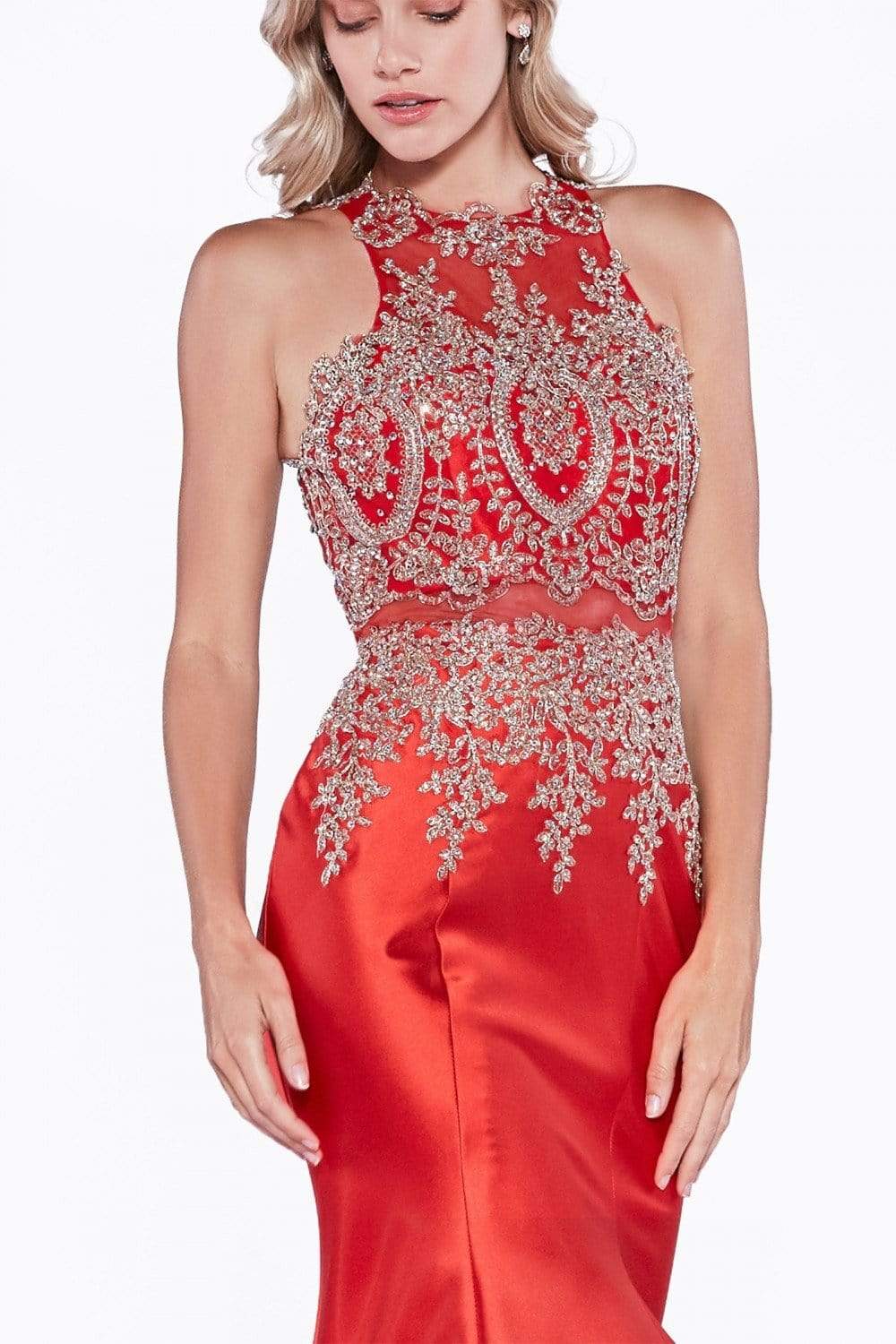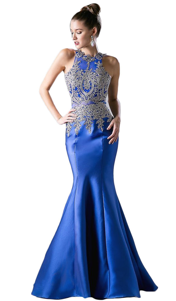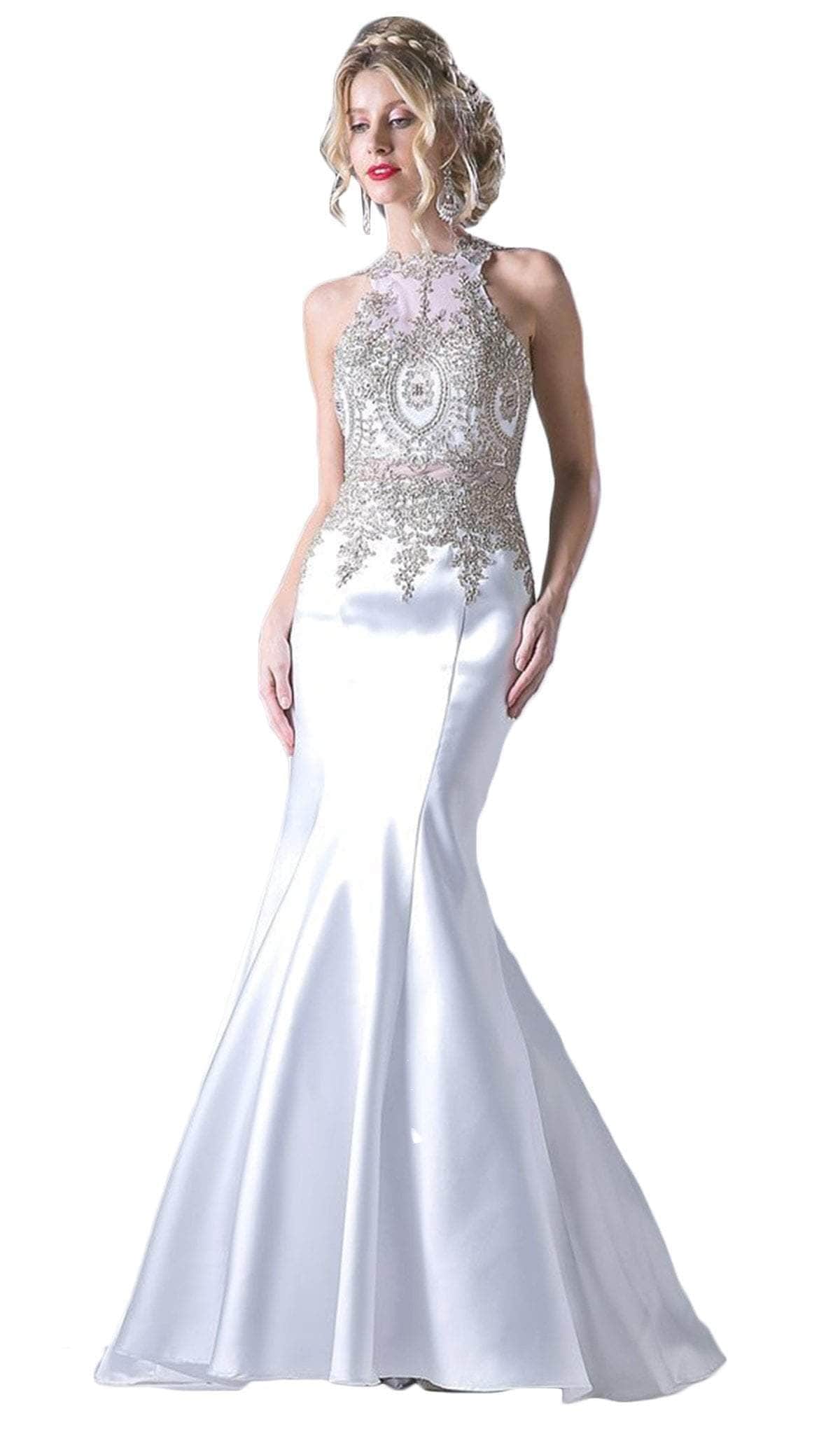 Walk into the room and promptly light up the interest in their eyes in this Cinderella Divine 8934 creation. Overlaid with tonal illusion bodice accented with metallic lace ornaments, this exquisite piece shows a high halter neckline framed with cut-in shoulders. Designed with a circular cutout along the ornate back, the natural waist is hugged with an illusion panel for that mocked two-piece design. The mermaid skirt is sculpted with tracing lines before flaring widely down to a full-length hemline and sweeping train. Unveil a sumptuous style in this exceptional Cinderella Divine masterpiece.