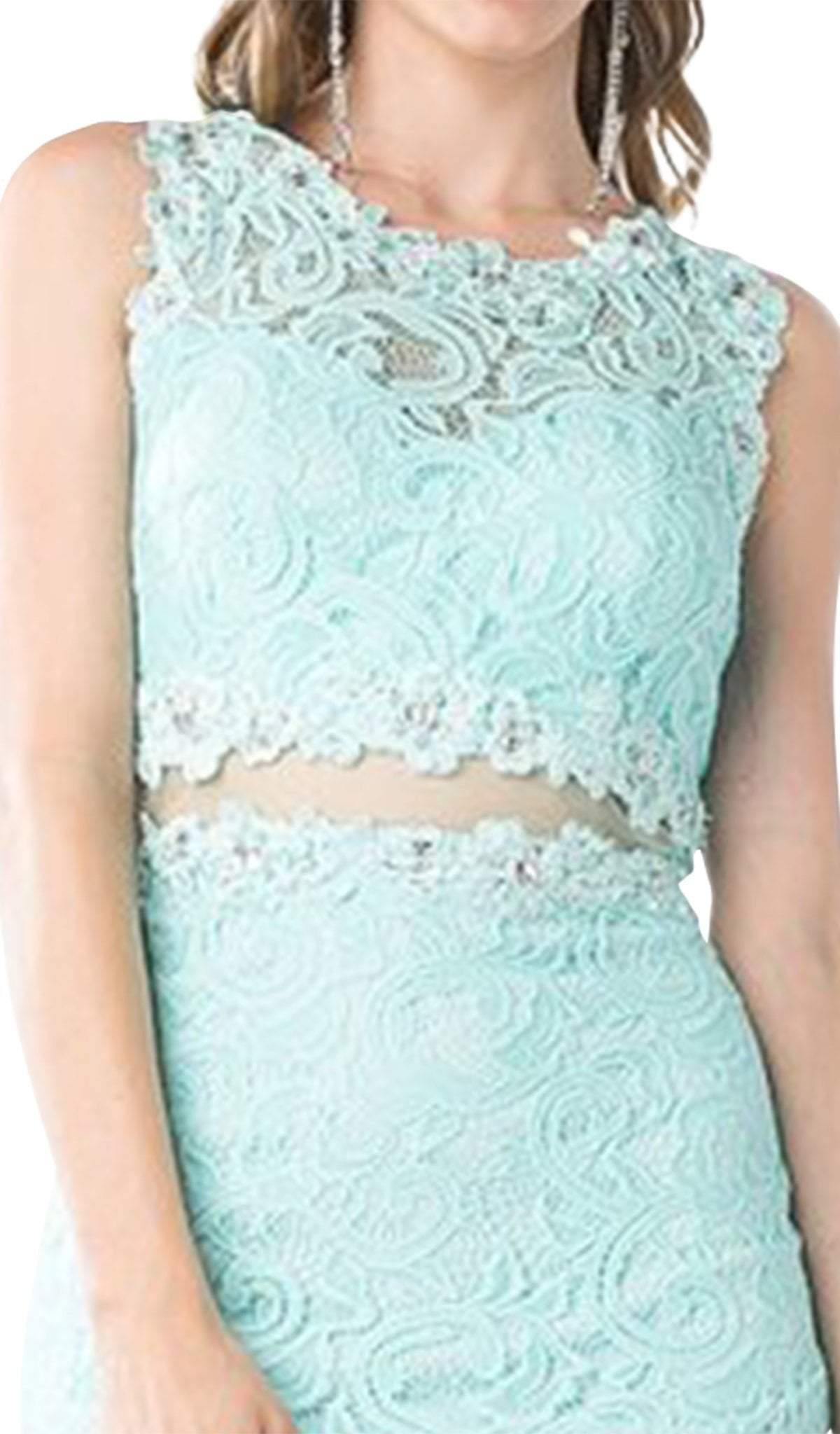 Shine with the iridescence of a new romance as you don this chic Cinderella Divine CF067S creation. Detailed with a stunning lace overlaying a tonal sculpted lining, this stunner shows a jewel illusion over a sweetheart neckline paired with a sheer full back. Enwrapped around the waist with a jewel appliqued illusion panel, the sheath skirt skims down the hips before ending in a short hem. Fall in love with the mesmerizing style of this exquisite Cinderella Divine masterpiece. Models are wearing the Coral, Mint and Royal colors.