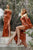 Gleaming with a wrap style bodice, this stunner promoted a sweetheart neckline with billowy bishop sleeves. Draped with a slit, the sheath skirt streams into a full length hemline. Model is wearing the Sage color.