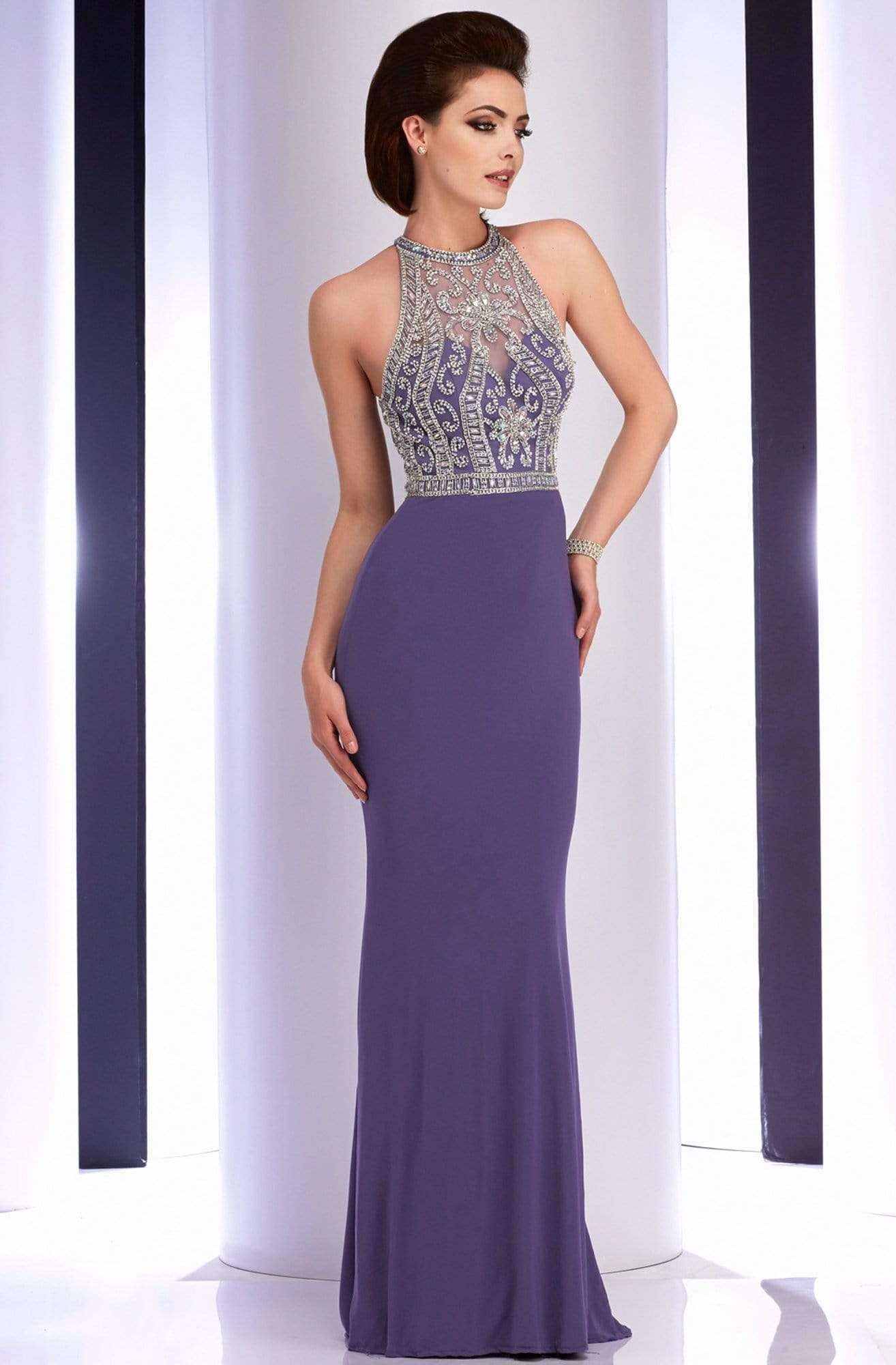 | Details: | Illusion Decolletage, Cutaway Shoulders, Embellished Waist, Sheer Racerback, Side Zipper, Full Length Hem |