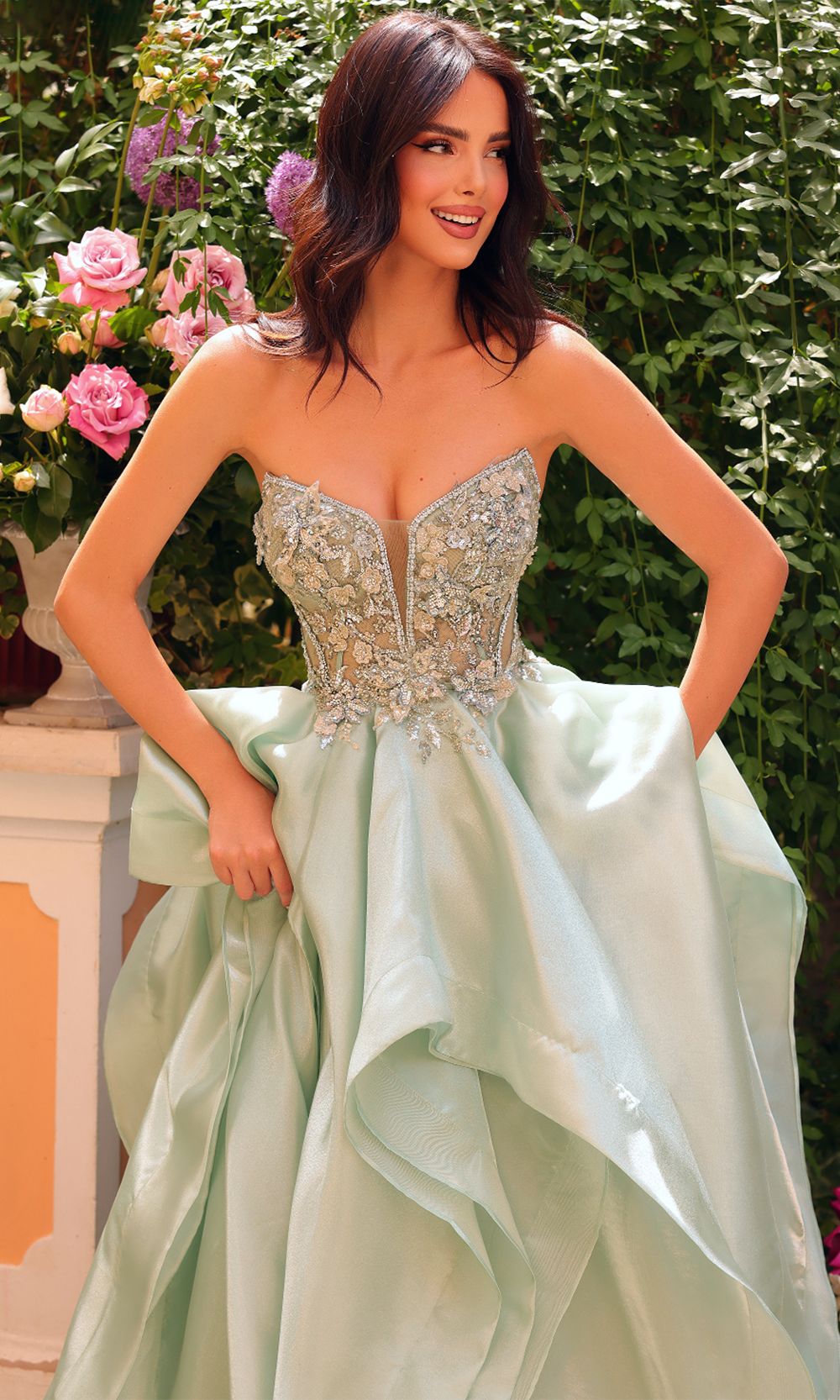 Make a lasting impression in Clarisse 62131, a ballgown designed to dazzle with its luxurious satin fabric. The strapless corset bodice is decorated with 3D floral applique and beaded embellishments, enhances the plunging sweetheart neckline while defining the silhouette. A voluminous ruffle skirt adds dimension and flair, moving gracefully with every step. Perfect for those seeking a combination of regal elegance and modern allure, this Clarisse 62131 creation ensures you shine from every angle. Model is wearing Shimmer Sage color.