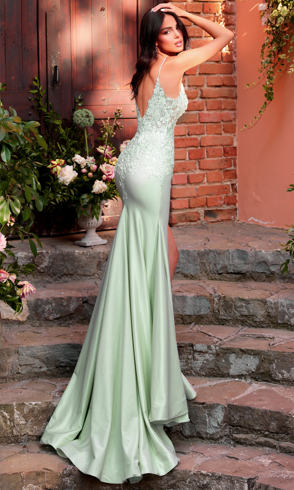Designed for those who crave a bold yet refined statement, Clarisse 62160 embodies the essence of modern glamour. The fitted sheath silhouette sculpts the body with precision, enhanced by lace appliques and soft beading that trace every curve. Its sheer corset bodice with a plunging v-neckline delivers allure, while the thigh-high slit brings contemporary sophistication. Fashioned in stretch shimmer jersey for comfort and movement, this gown exudes effortless allure from every angle. Make your next prom event unforgettable with Clarisse 62160, a captivating gown that defines elegance and confidence. Models are wearing Deep Periwinkle, Lavender, and Pale Mint colors.