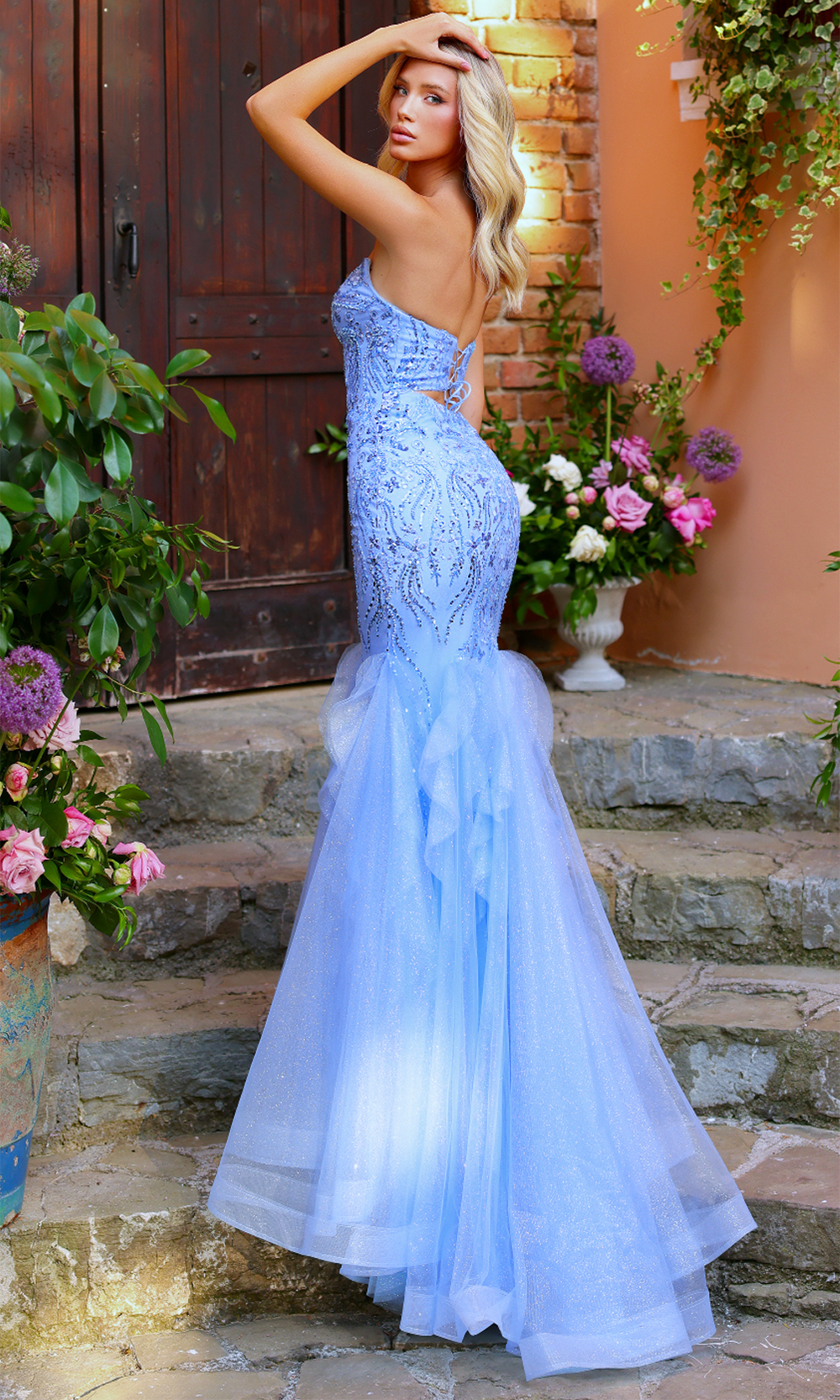 Designed to captivate from every angle, Clarisse 62258 radiates timeless sophistication. The plunging sweetheart neckline adds soft allure, while the strapless bodice accentuates the figure with precision tailoring. Beaded embroidery glimmers throughout the fitted silhouette, enhancing the gown refined structure. Layers of glitter tulle form a ruffle mermaid skirt that moves beautifully with each step, delivering grace and depth. Clarisse 62258 offers a perfect harmony of elegance and glamour for any unforgettable occasion. Model is wearing Sky Blue color.