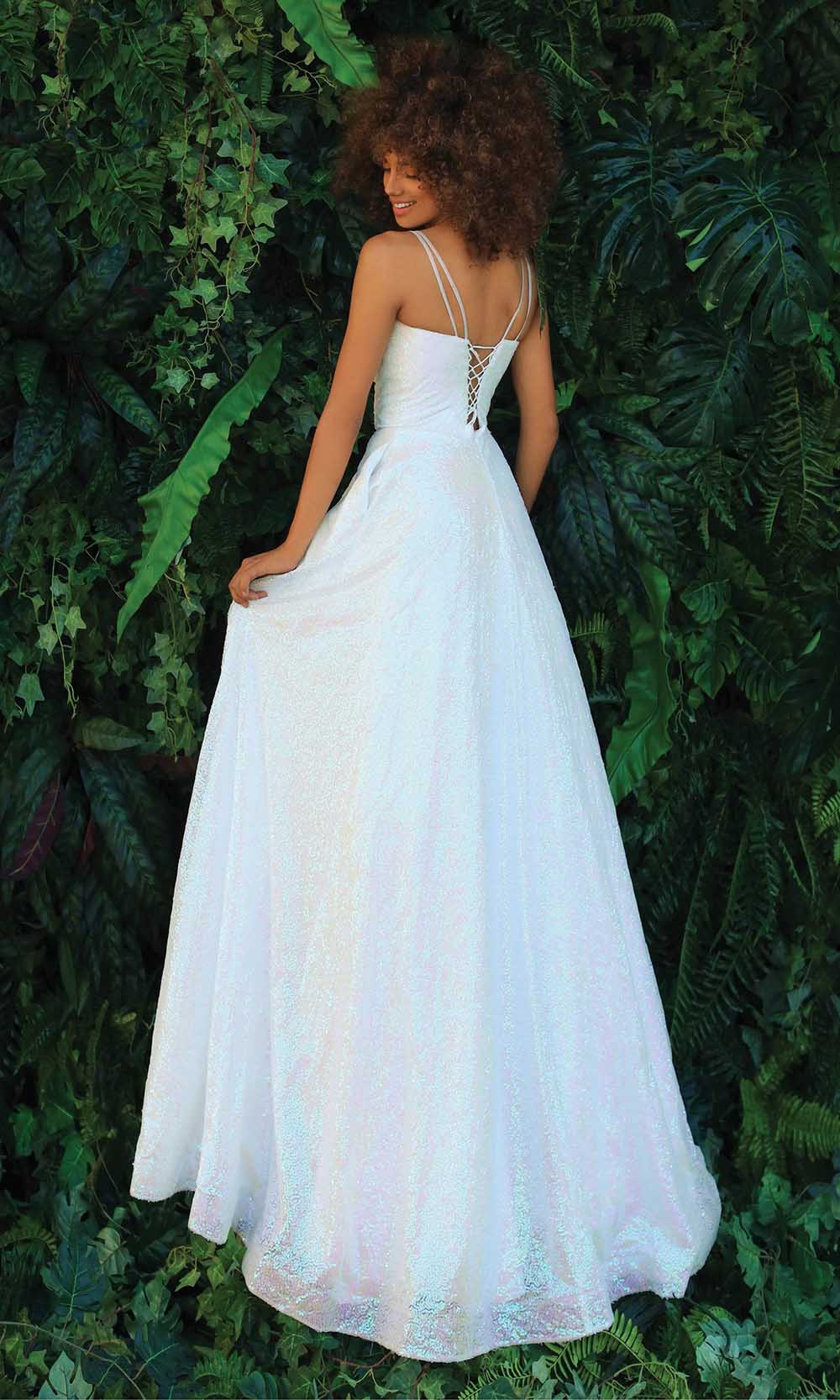 Glow with refined glamour in this Clarisse 810297 creation. Riddled with shimmering sequins, this piece shows a plunging v-neckline with a sheer inset. Stringed with a lace up styled back, the skirt flares into a stunning A-line silhouette and train. Saunter into that event with a stellar style in this Clarisse masterpiece. Models are pictured wearing the colors: Iridescent Ivory, Amethyst, Bubblegum Pink and Royal